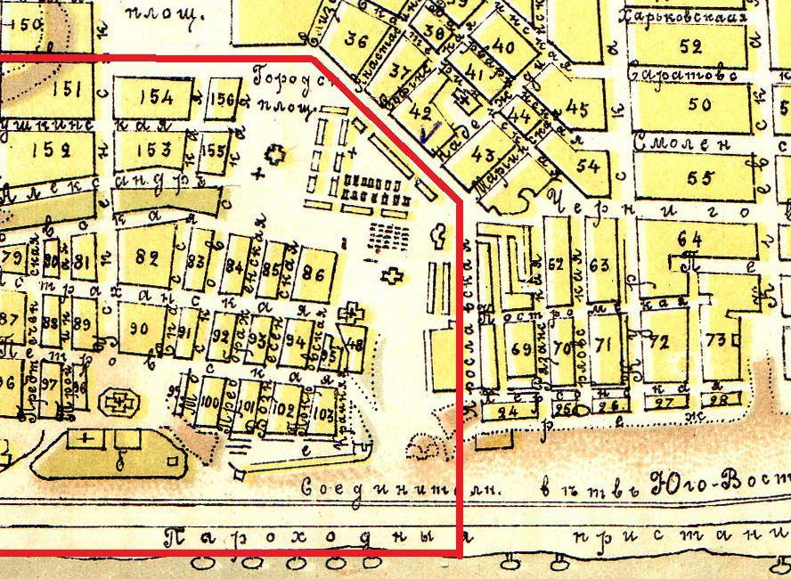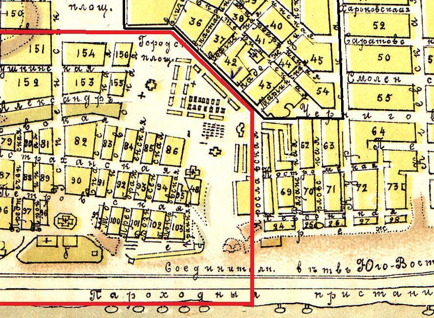 Из него, кстати, нетрудно понять, почему современный проспект Ленина в Бутырках назывался улицей Черниговской, а не Александровской, современная Советская - Костромской, а не Астраханской, современная Чуйкова - Херсонской, а не Петровской. Потому, что Бутырки возникли как отдельный посёлок вне Крепости. Какая поперечная улица первая за ней? Ярославская! В двадцатых годах двадцатого века она будет переименована в улицу Халтурина, что не удивляет - этого боевика-народовольца очень уважал Ленин. Любопытно другое: улица Ярославская (Халтурина) очень короткая - она заканчивается на уровне Черниговской - части современного проспекта Ленина, а не идёт к Вокзалу - ей преграждает путь Преображенский форштадт с его диагональными улицами, построенными как кратчайшие пути к Крепости, который обведён чёрным: