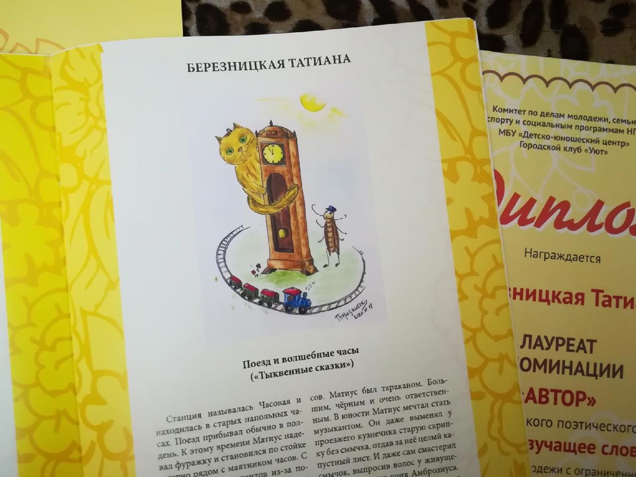 Автор: Татиана БерезницкаяПришли мои сказки! В этот раз фестивальный сборник солнечного цвета. Спасибо большое за возможность вновь принять участие в уже полюбившемся фестивале. А на страницы сборника этого года попали сразу две мои "тыквенные" сказки: "Лоскутное небо" и "Поезд и волшебные часы". Вторая сказка в память о любимом коте Кузе. Именно его фото послужило для иллюстрации сказки при её первой публикации в электронном информационно-краеведческом бюллетне "Искатель" в июне 2020 года.