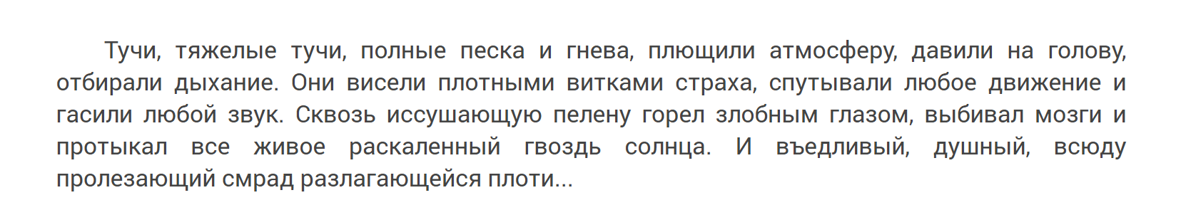 Тучи, тяжелые тучи, полные песка и гнева, плющили атмосферу, давили на голову, отбирали дыхание. Они висели плотными витками страха, спутывали любое движение и гасили любой звук. Жуткие видения, из которых человек даже толком не может понять, что это было – мираж, слуховой галлюциноз или сон.