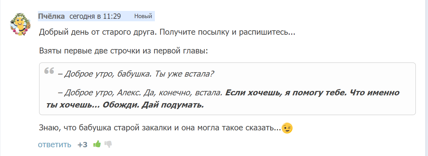 Пишем в комментах под книгой: "Привет от старого друга, которому делать нехрен" и посылаем итог.