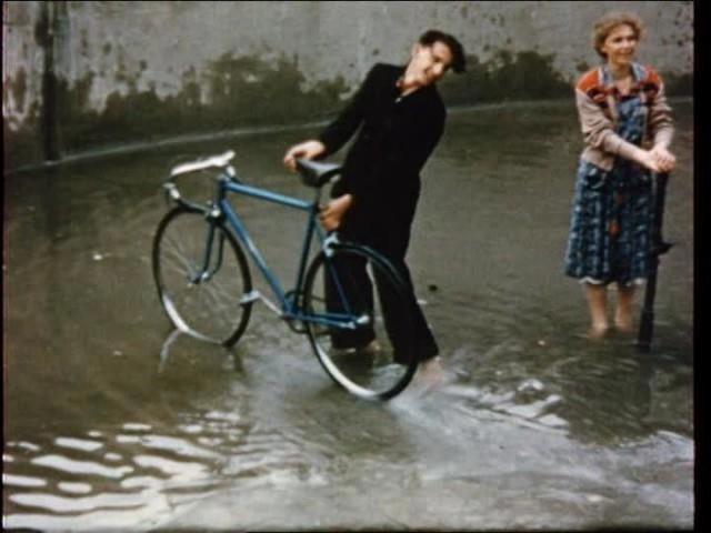 Непонятно, что происходит. Велосипедист босиком после проливного дождя? Зачем он крутит руками педали?