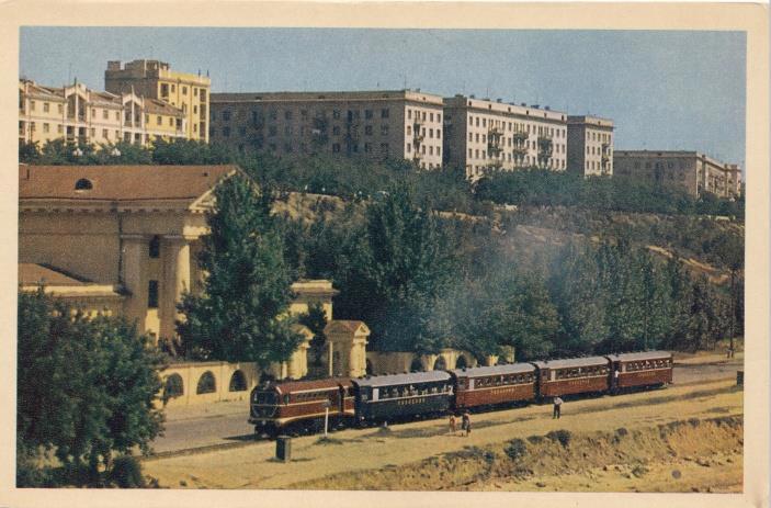 Представим себе, что спуск на Набережную не сворачивает налево, а продолжается прямо. Посмотрим на это с другой стороны - с Набережной -- на фото, судя по ещё действующей там Детской Железной Дороге, до 1978 года, но уже с тепловозом, а не с паровозом - то есть, шестидесятые - семидесятые годы. "Не зарастёт народная тропа", как говорил классик: справа протоптаная людьми дорожка - самое начало бывшей улицы Ярославской:
