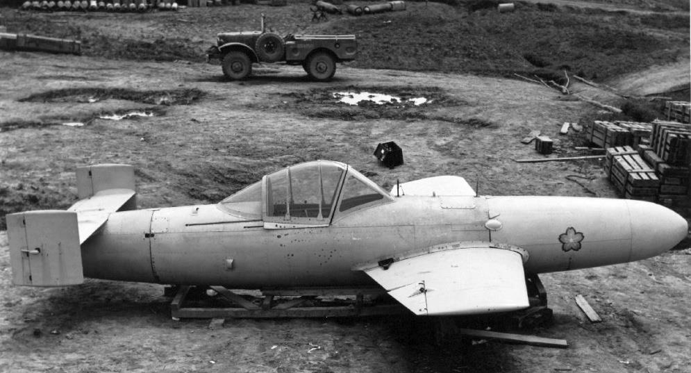 Может помните, может нет, но японцы использовали для воздушных атак кораблей противника чуть не все виды самолётов, которые были в их распоряжении. Кроме того, они разработали специальные катера-снаряды и самолёты-снаряды вроде вот такого реактивного самолёта с ругательным названием Yokosuka MXY7 Ohka образца 1945 года: