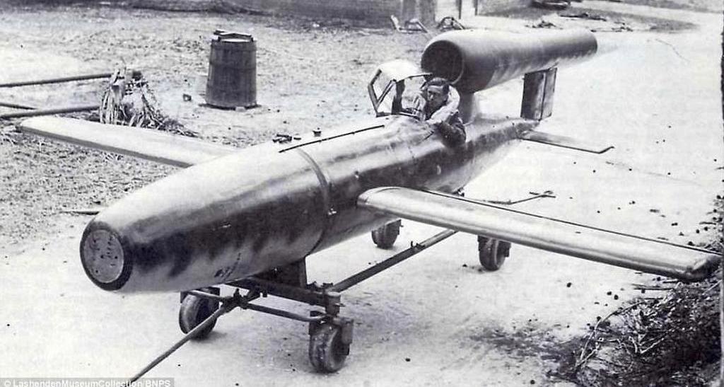 Немцы в качестве самолётов-снарядов, естественно, попытались первым делом использовать свои не очень эффективные ФАУ-1. Дело в том, что их точность была «никакая», а вот если внутрь посадить пилота, который сам выберет место, где его разорвёт в клочки… короче получалась вот такая хрень с пульсирующим реактивным двигателем под названием Физилер Fi 103R «Райхенберг»: