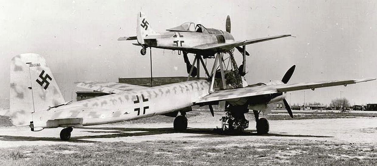 Вся эта двухэтажная фигня должна была как-то долететь до места, с которого хорошо видна цель. Потом пилот направляет агрегат в нужную точку и отцепляет бомбо-самолёт, который дальше пикирует на цель сам. А пилот, лихо развернувшись, здоровым и радостным возвращается на свой аэродром. Да… в теории. На деле штука получилась не только большая, но ещё и тихоходная, и не очень манёвренная. К тому же оборонятся от истребителей ей было нечем. Короче сбить её опытному лётчику-истребителю большой проблемы не составляло.