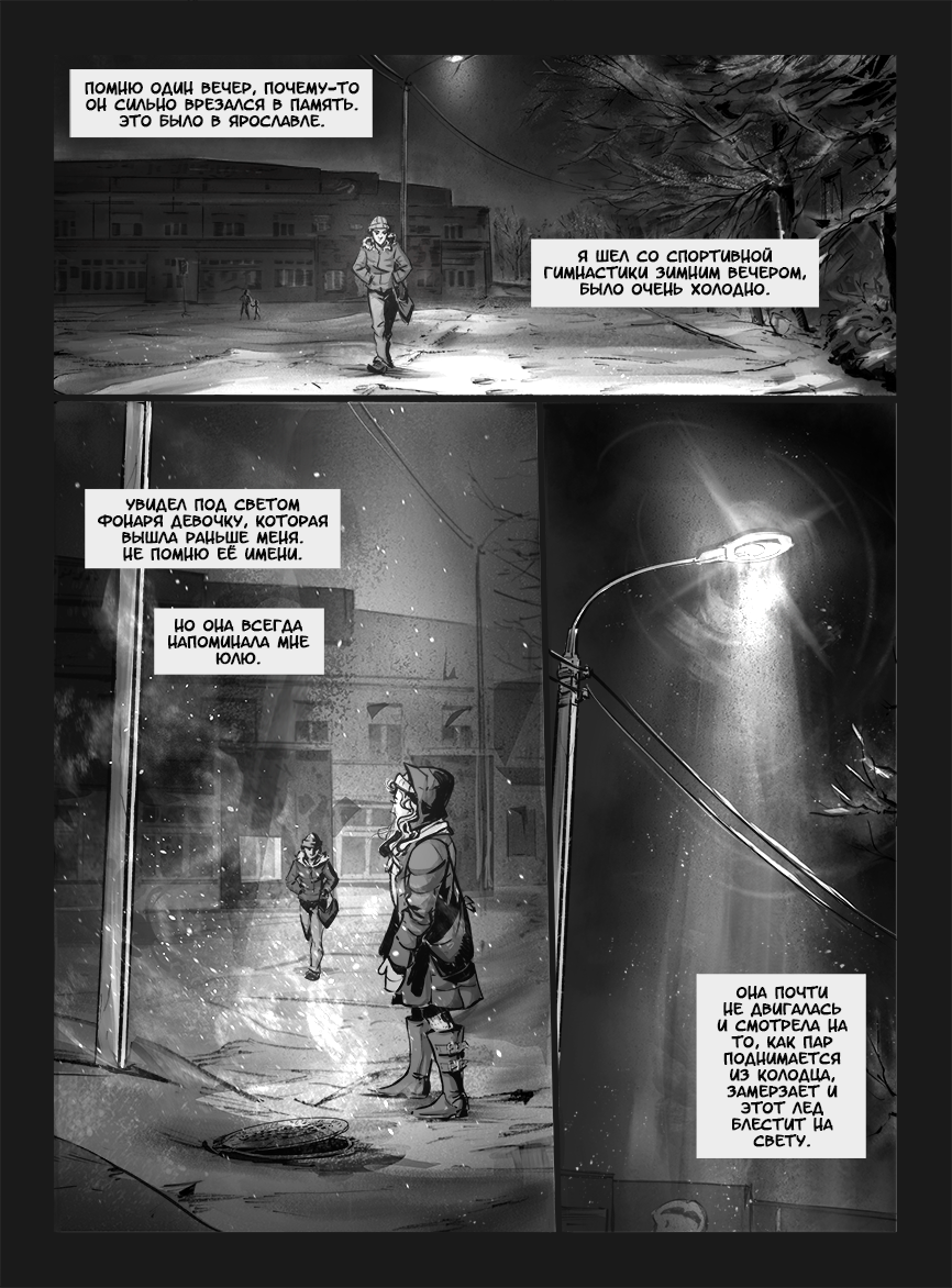 Автор: LennigenВ детстве часто проходила ночью мимо сломанного люка, из которого валил пар и замерзал. Это было очень красиво и завораживающе. Накоец я сделала сцену, навеянную теми впечатлениями.