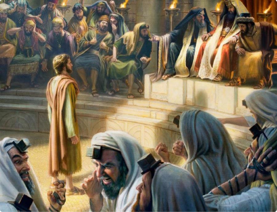 Странная черная коробочка на лбу у членов Синедриона - это тфилин. Элемент молитвенного облачения иудея. В тфилине есть полости, куда закладываются 4 отрывка из священной книги Торы. Еще такую же коробочку повязывают на левую руку. Обычай существовал еще во времена римского владычества над Иудеей. Все это символизирует готовность иудея подчинить все свои действия и желания воле Бога. Но как узнать волю Бога? А для этого есть священники. Они трактуют знамения, священные книги и совершают жертвоприношения.