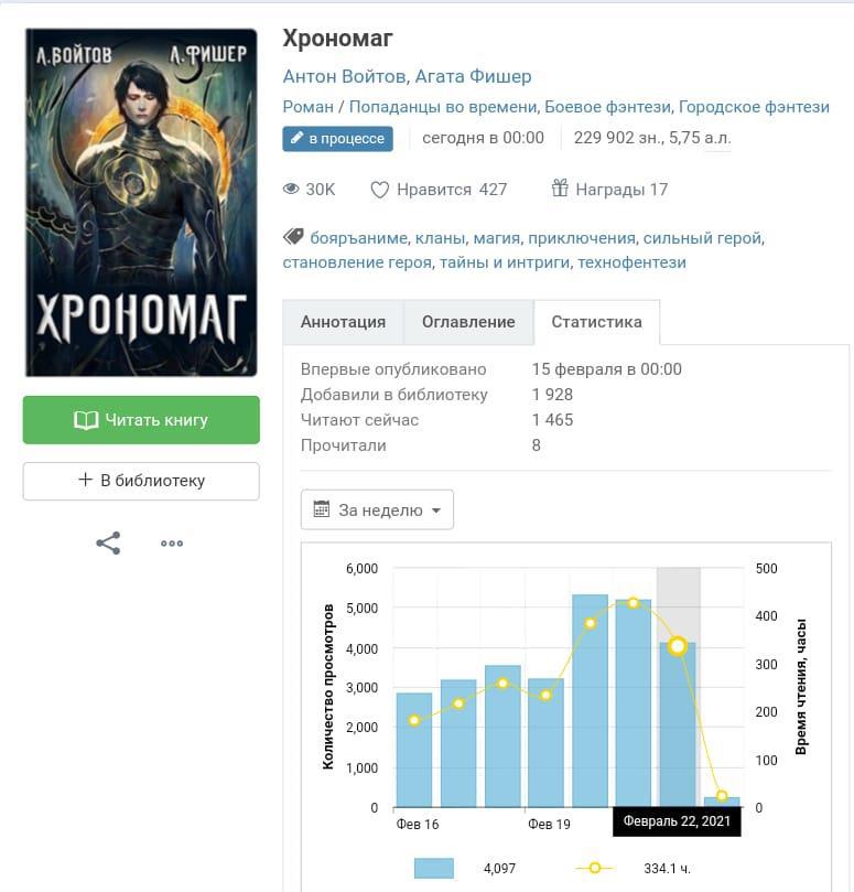 9. Михаил Дорохов. Публикуется на АТ с января 2018 года. На момент старта имел чуть больше 400 подписчиков, из которых более 300 были неактивны из-за двух крупных перерывов между выкладками книг. Встал с новой книгой в ГН на третьи сутки после её старта.