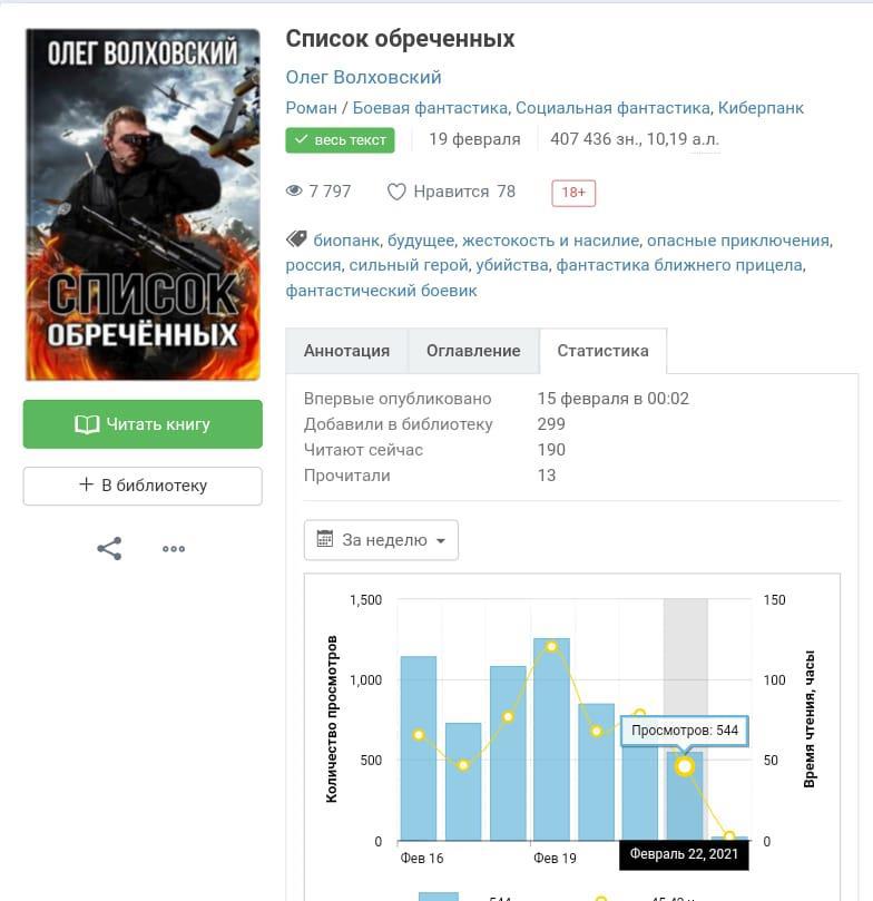 5. Наталья Точильникова. Получила КС на базе того, что она публикующийся на бумаге автор. Решила начать заново, на новом аккаунте под привычным уже по бумажным изданиям псевдонимом Олег Волховский.