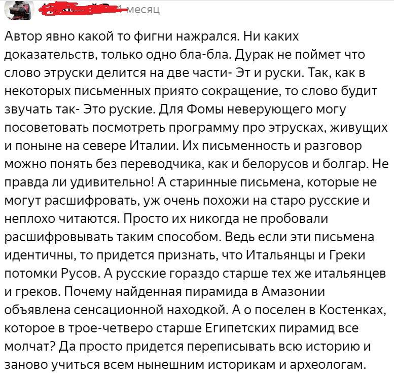 Автор: DayneenНа Яндекс Дзене мне попалась забавная статья о людях, что всерьёз связывают древних Эрусков и Русских на основе совпадения звучания этих слов на сегодняшнем русском языке.