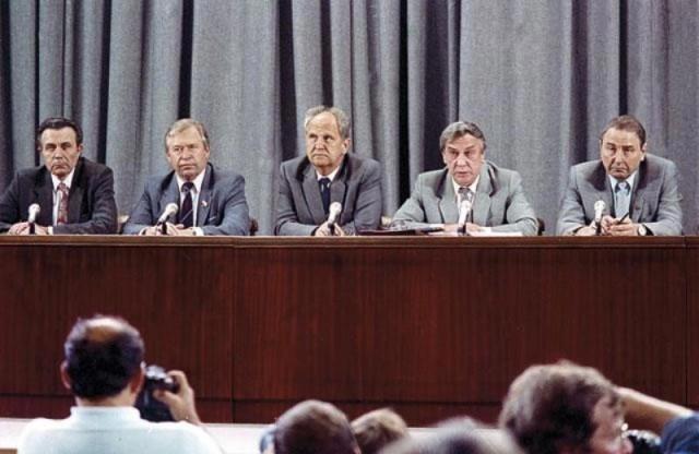 19 августа 1991 г. ГКЧП. Слева направо А. Тизяков, В. Стародубцев, Б. Пуго, Г. Янаев и О. Бакланов. Фотохроника ТАСС: