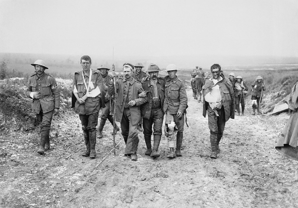 Немецкий пленный помогает эвакуировать раненых британских солдат.