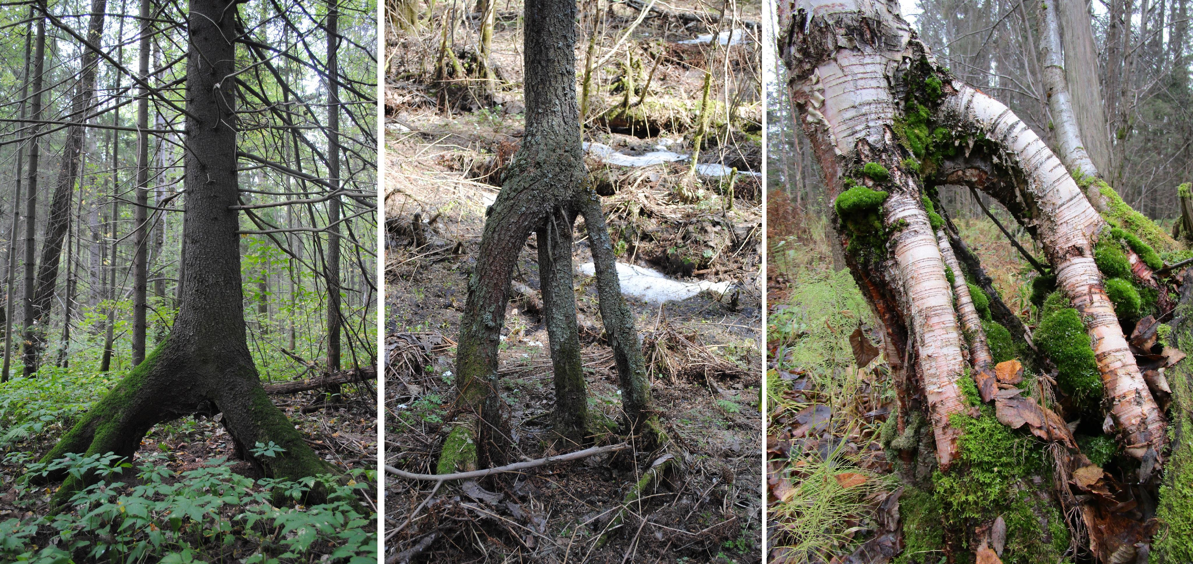 Разгадка же этого феномена проста. Когда-то семена деревьев, попав в щели трухлявых пней, особенно на старых вырубках, прорастают и легко пронизывают своими корнями разлагающуюся рыхлую древесину. Корневая система молодого дерева формируется не в грунте, а в пне - над уровнем почвенного покрова. После полного разложения и разрушения пня корни молодых деревьев оказываются обнажены. Именно так рождаются "шагающие деревья".