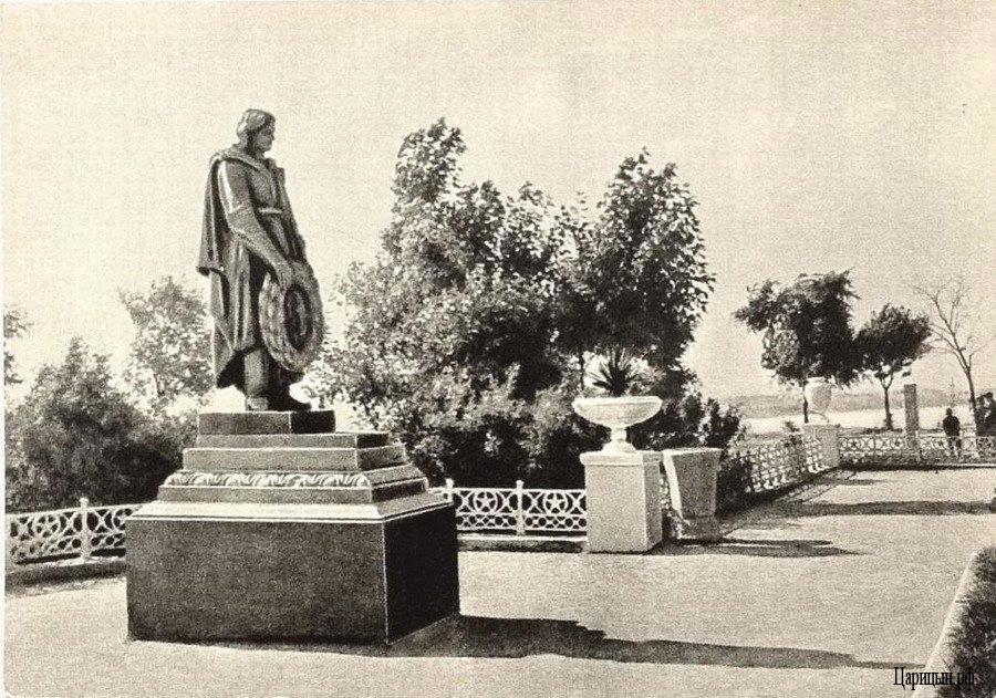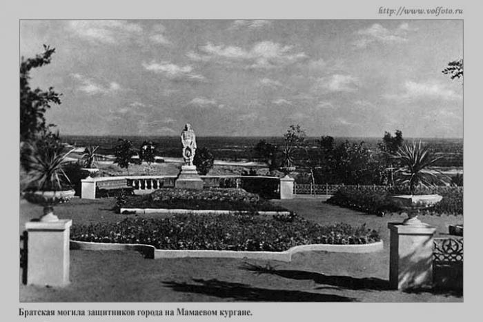 Вернёмся в 8 февраля 1943 года, когда не прошло ещё и недели после окончания Сталинградской Битвы, когда Город лежал в развалинах, везде стояла разбитая техника и лежали вмёрзшие (февраль был очень холодным) в землю не похороненные тела. Тогда добровольная похоронная бригада, состоявшая из женщин, на самой вершине Бугра, возле братской могилы и обнаружила гипсовую скульптуру девушки в военной форме, в плащ-палатке и тяжёлых сапогах, но без головного убора, "принесшую" на могилу венок. Автор скульптуры неизвестен. Как она там оказалась - тоже, никаких документов по её установке нет, да и не до памятников в те дни было руководству Города: были дела поважнее, и в первую очередь захоронение тел во избежание эпидемий. В первые же послевоенные годы братская могила была облагорожена, а скульптура установлена на постамент: