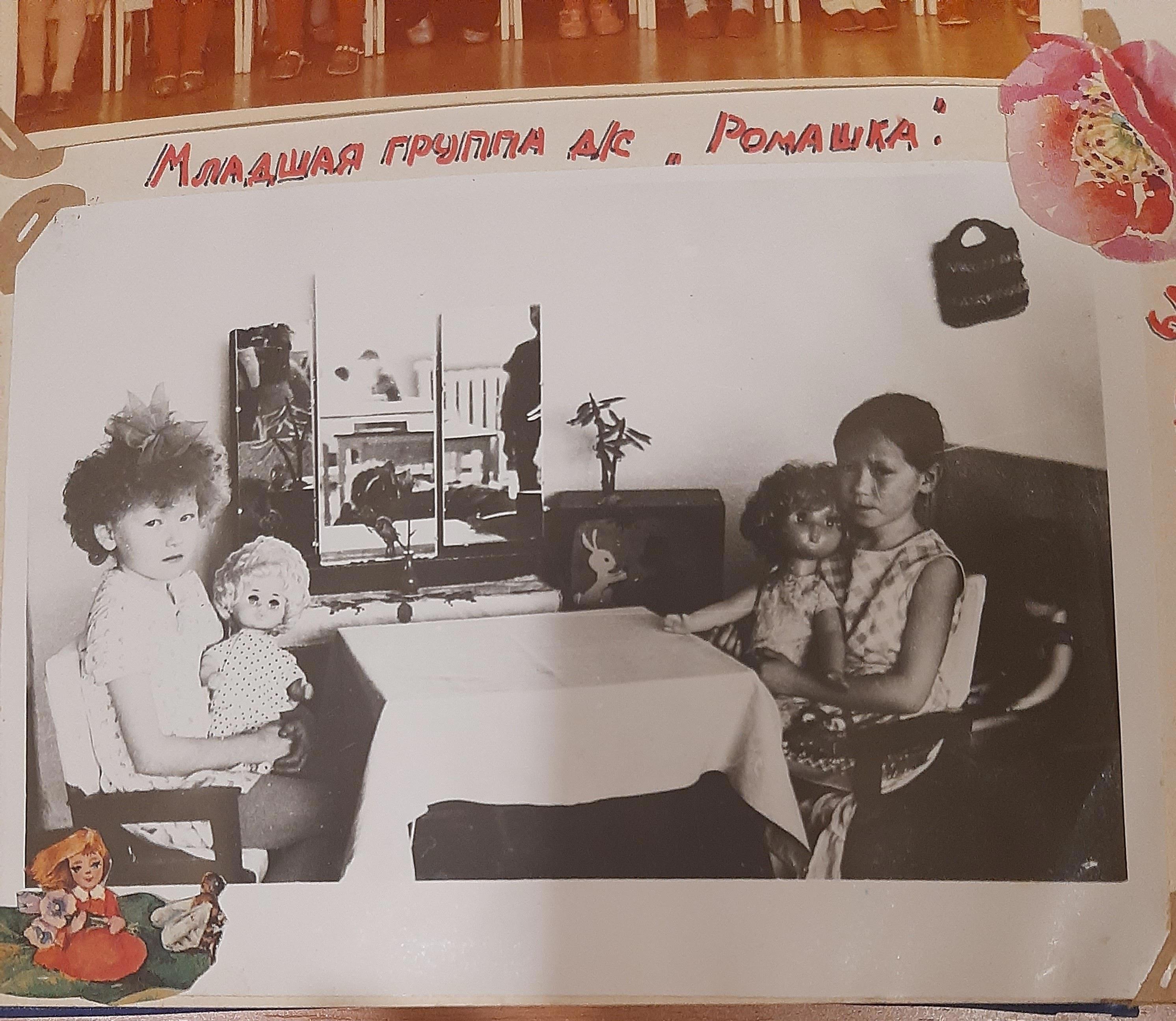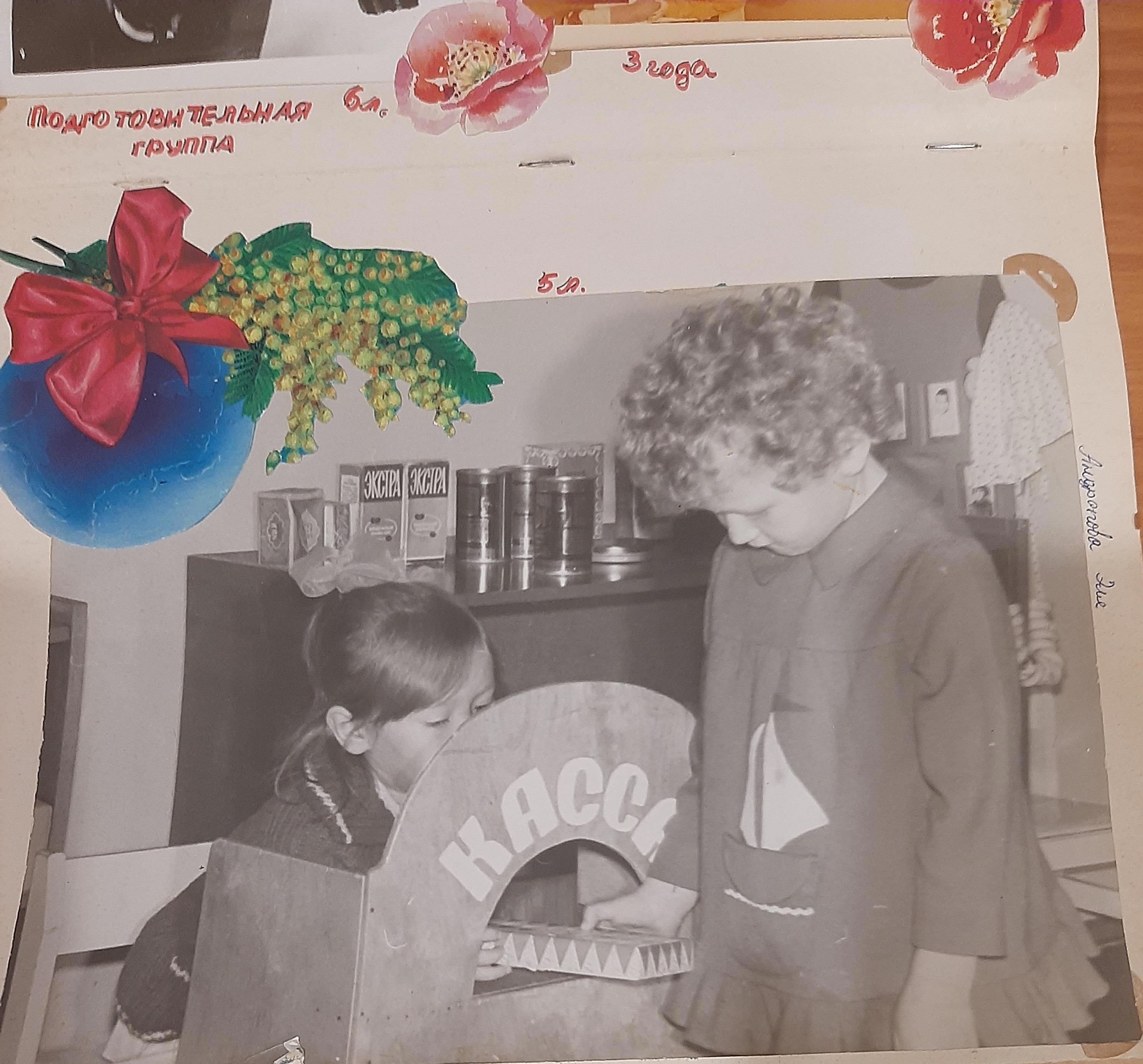 Но в пять лет вовсю позировала заезжему фотографу в детском саду. Была целая серия фото, почему-то, всегда с кудрявой Элей в паре. Тут я примеряю уважаемую профессию продавца на себя: