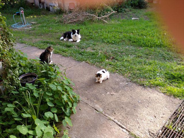 Двое из пяти приблудных кошек и котов, которых мы поставили на довольствие. Старенькая бордер-колли посмотрела и решила тут жить, тут вкусней кормят, чем у хозяев. Фото сделано позавчера...