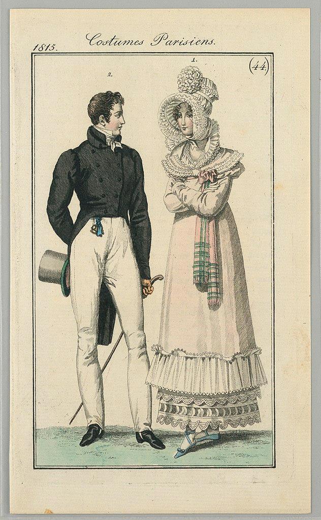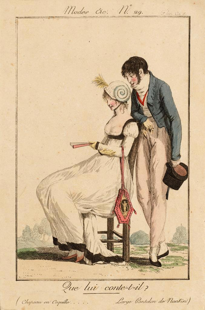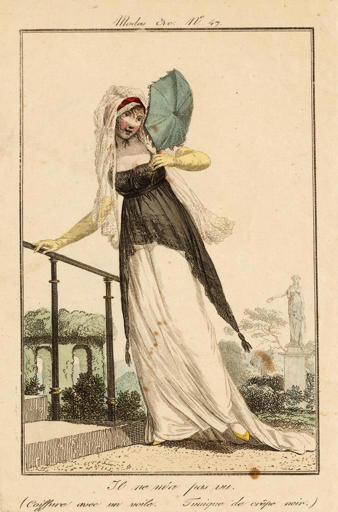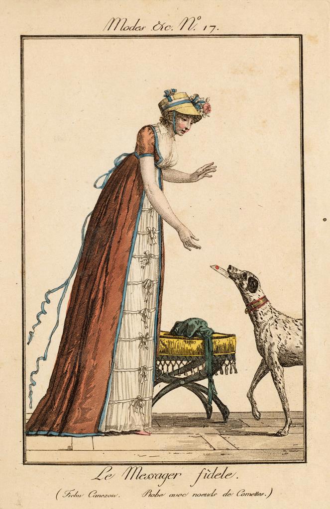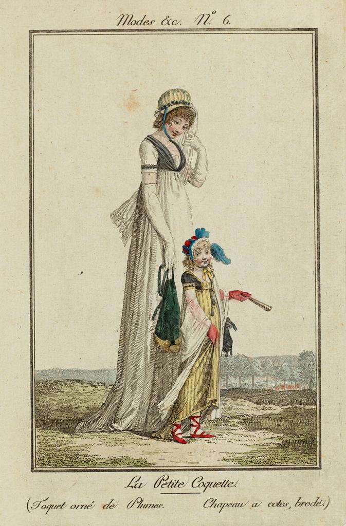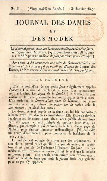 С 1797 по 1839 годы в Париже издавался "Journal des dames et des modes". Это издание обычно состояло из восьми страниц текста и одной или двух цветных вклеек с изображениями костюмов, как женских, так и мужских. Журнал выходил каждые пять дней и на пике популярности имел тираж около 2 500 экземпляров. В каждом номере рассказывалось о последних новостях, которые могли быть интересны женщинам, описывались аксессуары типа шляп, шарфов, перчаток, вееров, лорнетов и т.п. Составитель также информировал своих читателей о парижских спектаклях, концертах, выставках и наиболее популярных местах для прогулок.