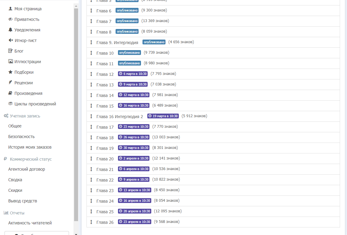 Тут будет проще выставить скрин запланированных публикаций. Как вы заметили, главы будут выходить по вторникам и пятницам в 10:30. Размер глав варьируется от пяти до тринадцати тысяч символов, поэтому у меня к читателям большая просьба - если вдруг увидели маленькую главу, не стоит сразу кричать, что "автор скатился", обидно очень.