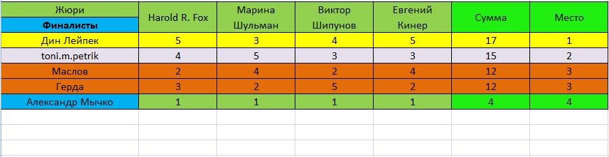 Прошу вас, распределить между финалистами места, путем выставления оценок.