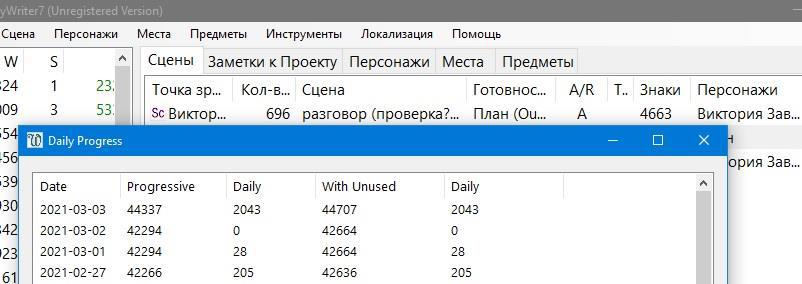 . Это результат только готового!!! текста будущих историй. Все пометки и прочее в проге вне текстов сцен - не считается! и тем более я сама не считала всё, что не текст (посты и комменты в бложиках, прочие статьи и тд). Кроме того, как выяснилось, программа еще и выкидывает из статистики то, что в процессе вырезается. То есть сегодня я повыкидывала из "сцен" много давнишних "черновиков" и за малым вообще не ушла в минус