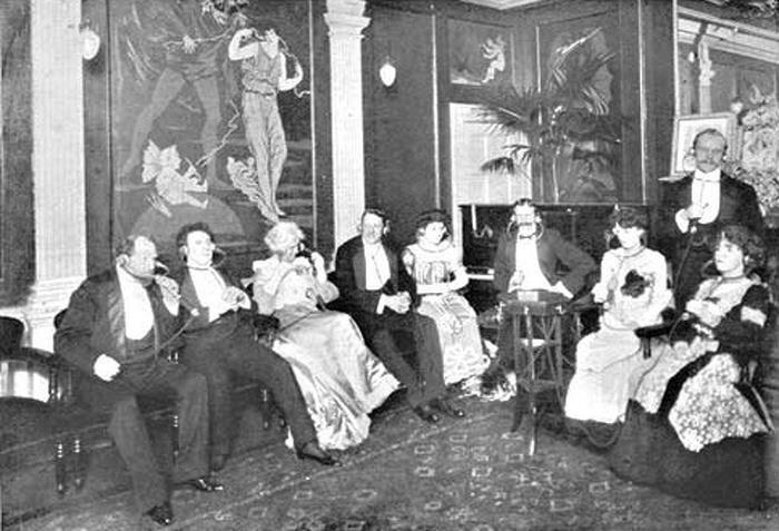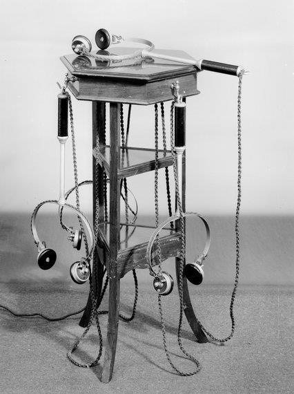 Для прослушивания всех этих трансляций клиентам выдавались специальные наушники. По сравнению с классическими, которые мы привыкли видеть одевать на голову, их предшественники были «перевернутыми» и надевались так, что дуга оставалась со стороны подбородка. Такие наушники надо было поддерживать специальной тростью.