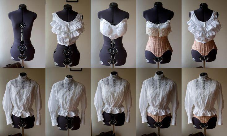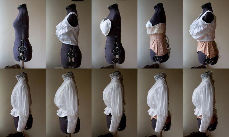 Но это было в Америке) Тем временем в Европе, в частности в Англии, женщины использовали проверенные способы:) Накладки, которые подшивались к нижней рубашке или корсету, многочисленные рюши, которые имелись не только на рубашке, но и верхней части нижнего белья (получился каламбур, но думаю вы всё поймёте:)) для наглядности вид спереди и вид сбоку