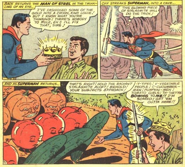 Венера в комиксах – тема отдельного текста; оттуда родом не один злодей и не один герой. Но нельзя не упомянуть, как планету представляли в DC. В 1962 году, когда «Маринер-2» как раз приближался к Венере, чтобы навсегда отнять у человека надежду на ее благополучную колонизацию, в 151-м выпуске «Супермена» мы познакомились с ее обитателями. И оказалось, что на планете живут овощи — буквально, живые помидоры, тыквы и огурцы.