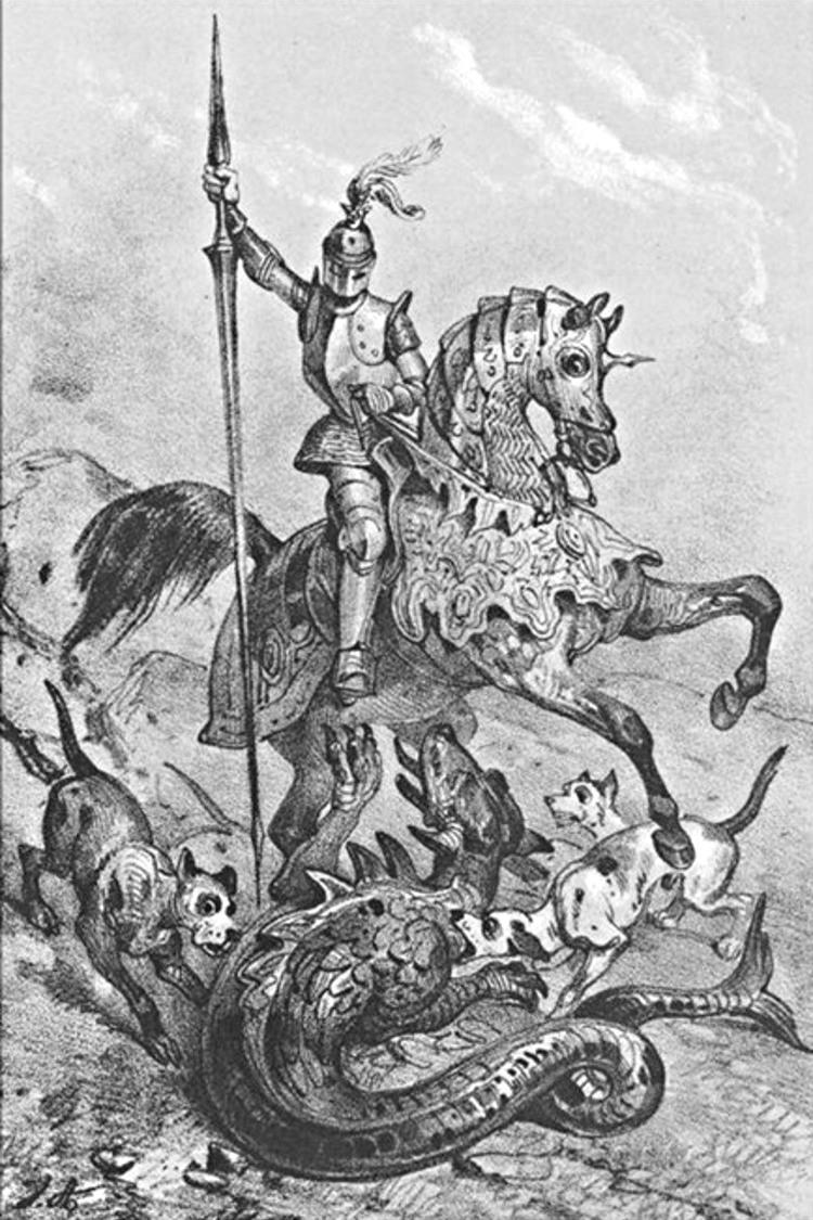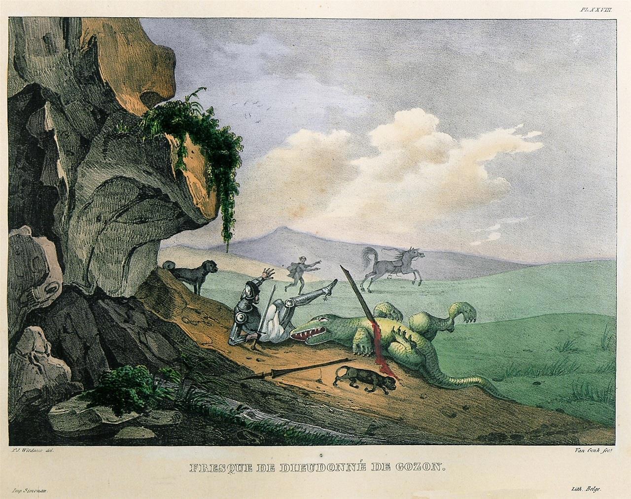 Этот жуткий зверь бесчинствовал на острове и поубивал много людей, пока отважный рыцарь Дьёрдонне де Гозон не нашёл на него управу. Примечательно подробное и доходчивое описание метода Дьёрдонне. Говорили, что он уезжал домой в Тараскон и тренировался курощать дракона, используя деревянный макет в натуральную величину! А потом возвратился на Родос и победил яростного гада с помощью своих специально натасканных боевых собак.