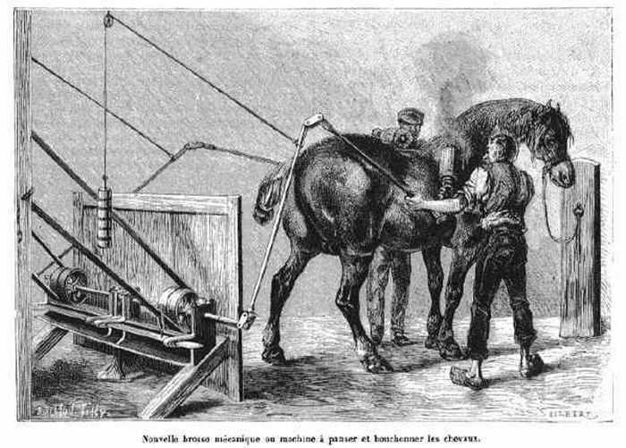 Подобное произошло и с механической машиной для чистки лошадей. Мало того, что она была настолько сложной, что для ее обслуживания требовался механик, так ещё и лошади пугались шума и лязга этой машины.