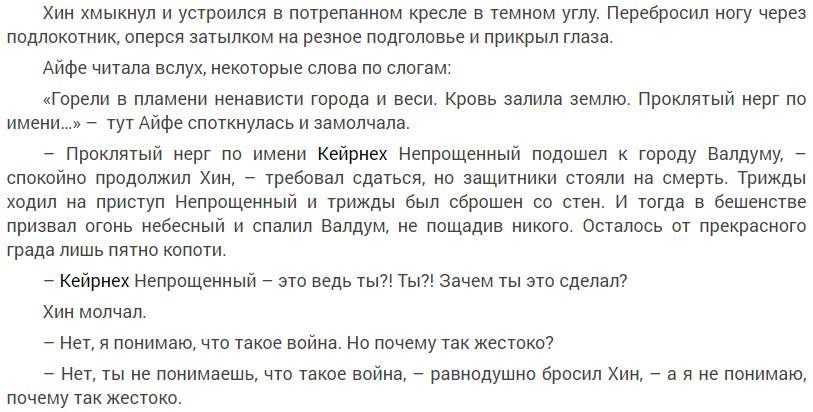 Ну и номером десятым (хотя знал бы он, скольким блистательным и знаменитым персонажам пришлось отсюда потесниться!) будет замечательный персонаж повести Влады Дятловой «Непрощенный» Хин. Хин королевский пес, Хин королевский раб, Хин хладнокровный убийца. Он же — Кейрнех, последний лорд Нерга. Жестокий и великодушный, злой, резкий, грубый и одновременно преданно любящий свой народ, свою семью, свою родину. Он также несет на плечах бремя былых преступлений, и презирает самого себя, и всех остальных презирает еще больше. В нем та же гремучая смесь циничного эгоизма и безоговорочной самоотверженности.