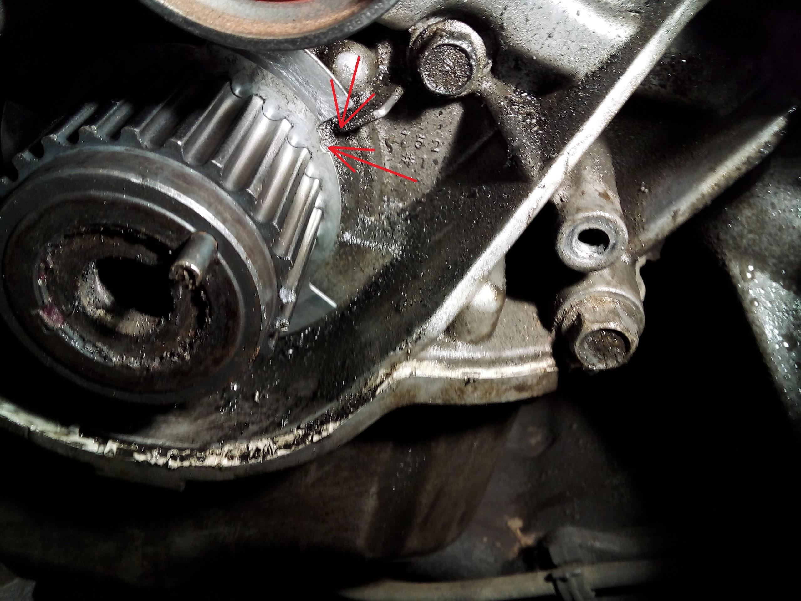 На реперном диске датчика положения коленвала (который был не прикручен) есть углубление, его совмещаем с приливом на маслонасое - всё, первый цилиндр в верхней мертвой точке. Ставим распредвалы по меткам (левый пытается сбежать), и накидываем ремень.