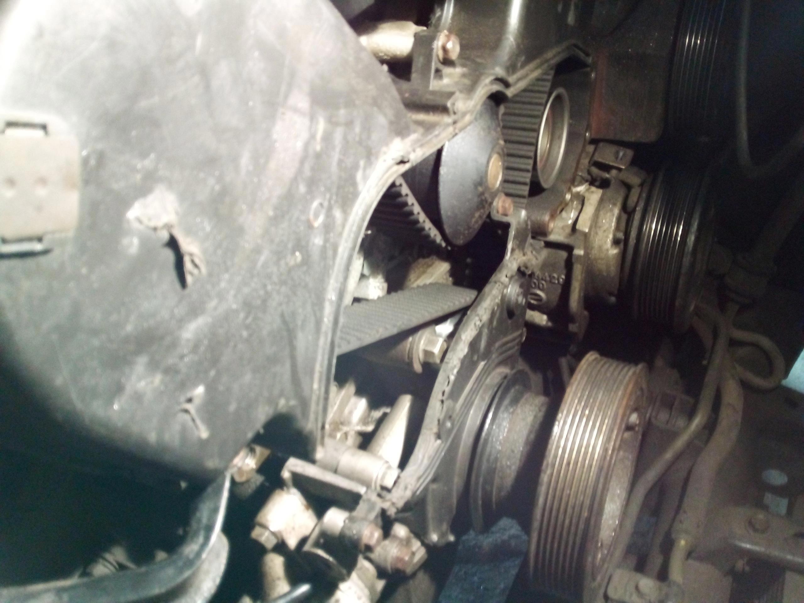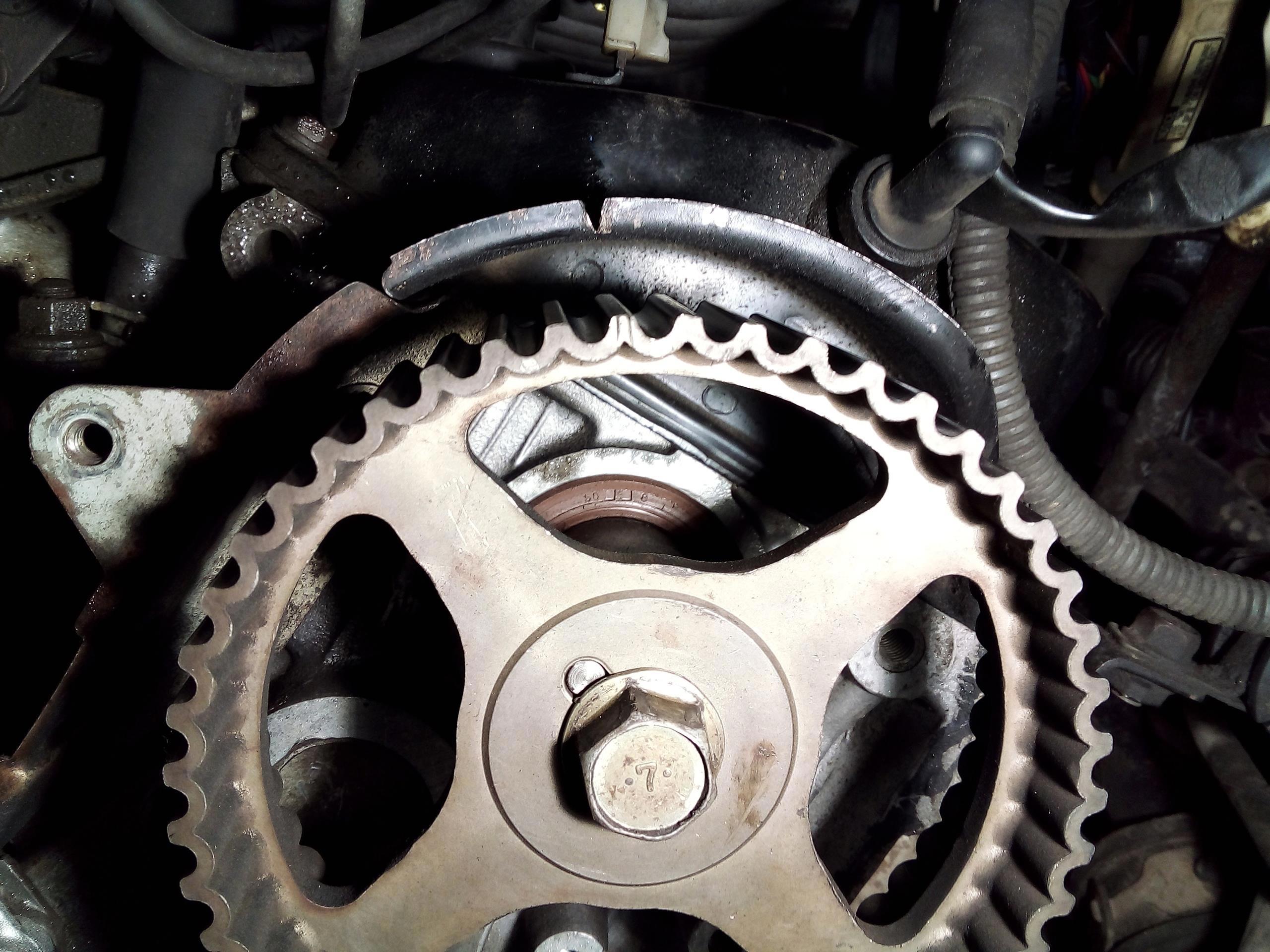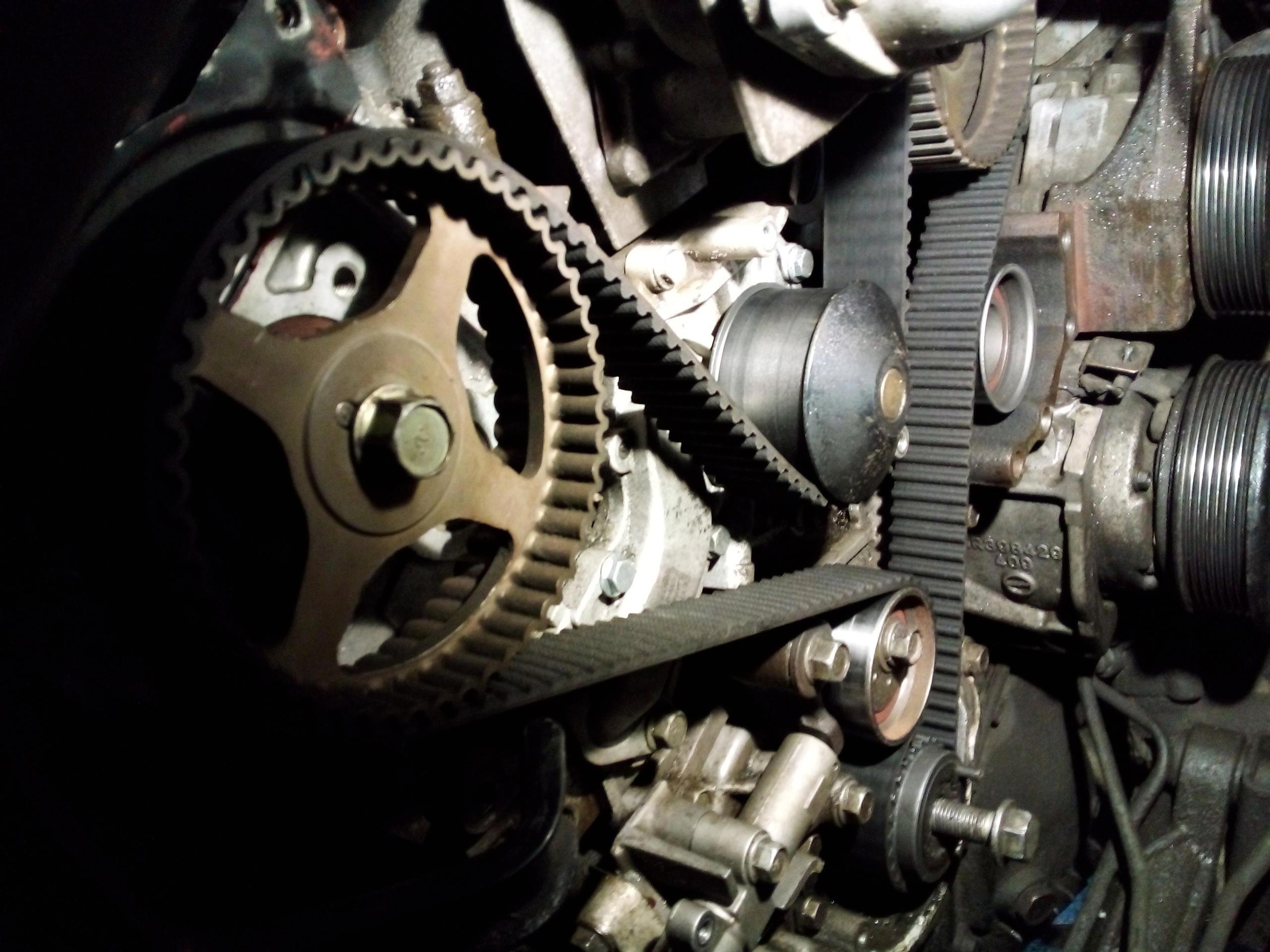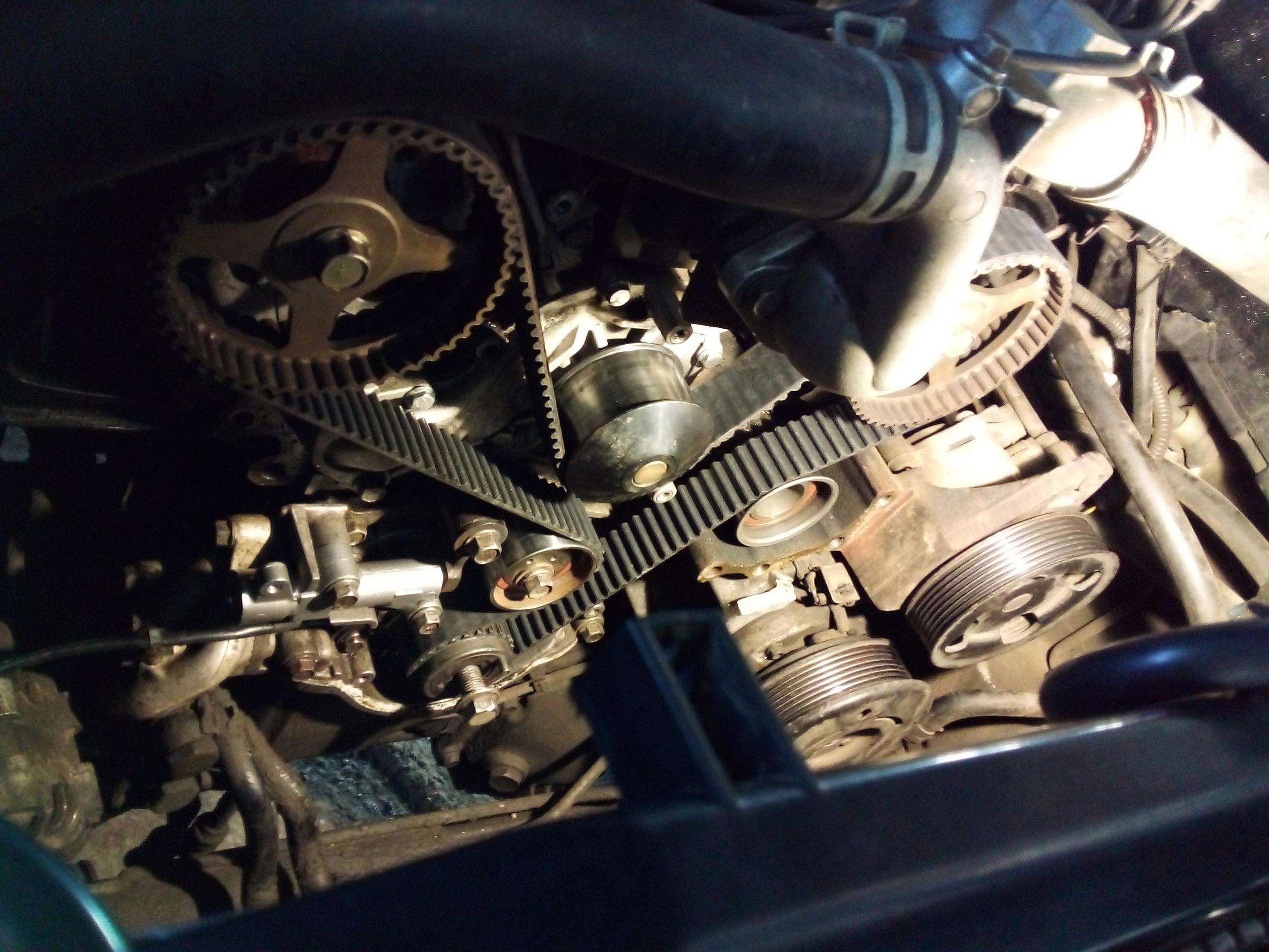 Разобрав кожухи выставил метки на распредвалах. Смотрю метку на колене - и не вижу её! Нету. Покрутил колено по часовой стрелке, нашел метку - на валах уплыли. Потянул ремень наружу около натяжителя, а он свободно ушел. Натяжитель автоматический масляный, и есть в нём один нюанс - его надо прокачивать штоком вверх, потом сжимать штоком вверх, ставить чеку, и ставить его на машину. Если этого не сделать - натяжитель не будет работать, что и было с этим автомобилем. Колено перепрыгнуло по ремню, и метки ГРМ ушли, при этом при старте мотор ужасающе гремел (я когда первый раз им занимался аж напугался, но хозяин сказал что норм, так и должно быть), после замены ремня и правильной установки нового натяжителя двигатель завелся очень мягко, и работал просто замечательно. Ещё обнаружил не прикрученный датчик положения коленвала, который болтался. К тому времени я уже даже комментировать это всё не мог. Есть у этого мотора ещё один прикол - натяжной ролик с эксцентриком, и если его правильно не взвести - ремень может прыгать если натяжитель установлен неправильно. В нашем случае было всё в куче...