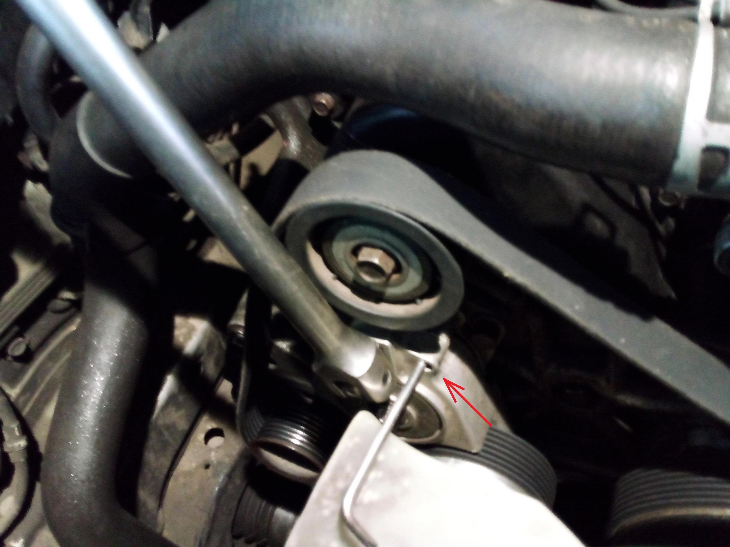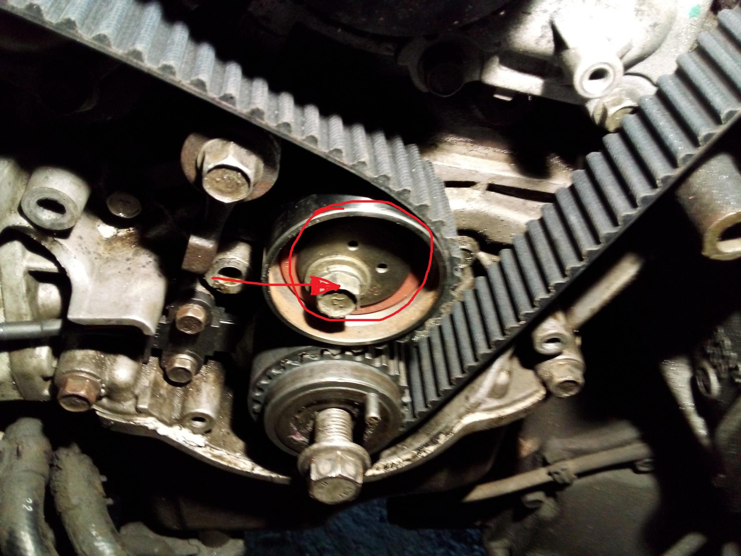 Вот это - взведенный эксцентрик натяжительного ролика. Если он повернут сильно влево - натяжения не будет. На фото он сильно повернут вправо, позже я его слегка повернул на лево.