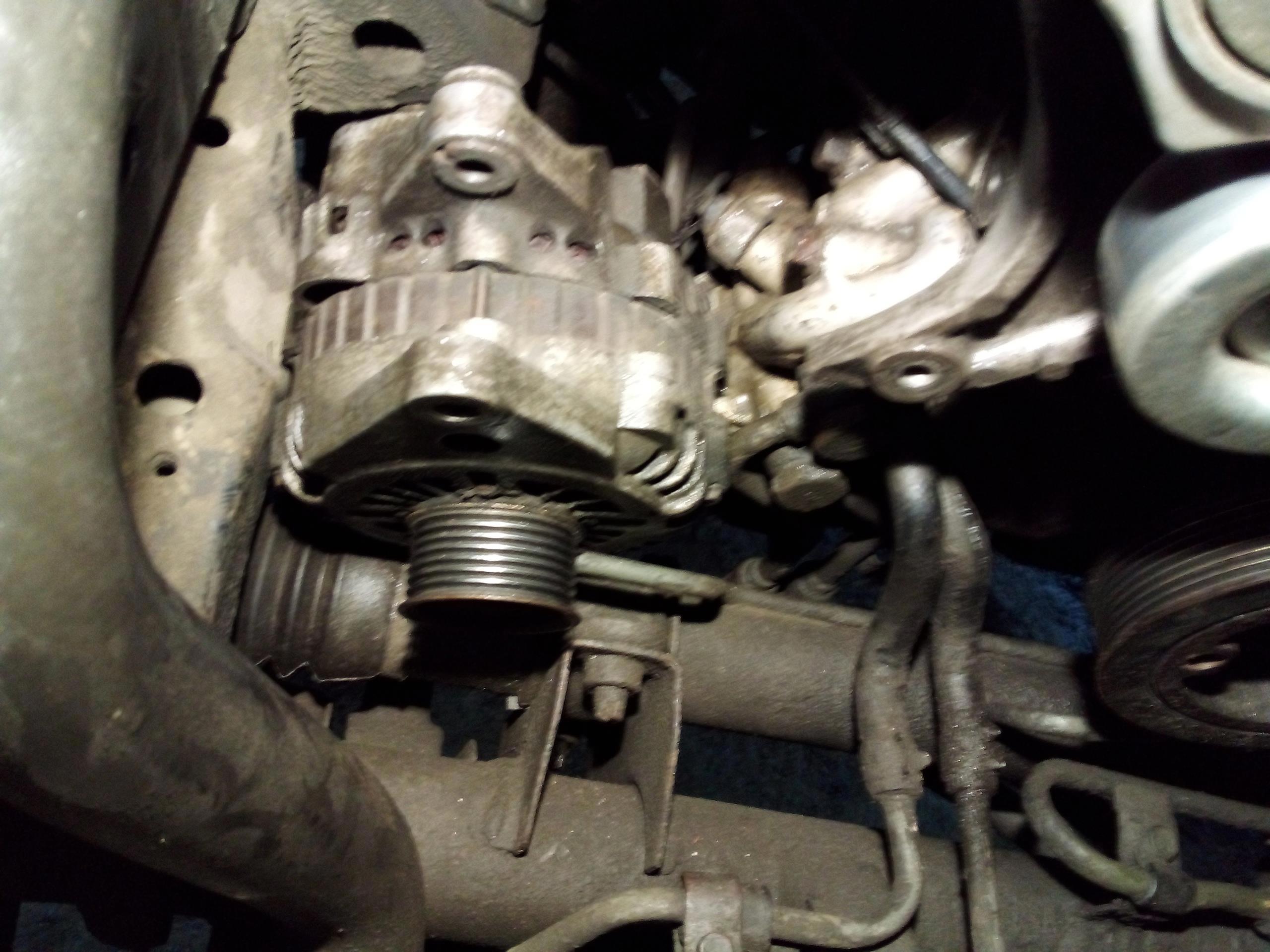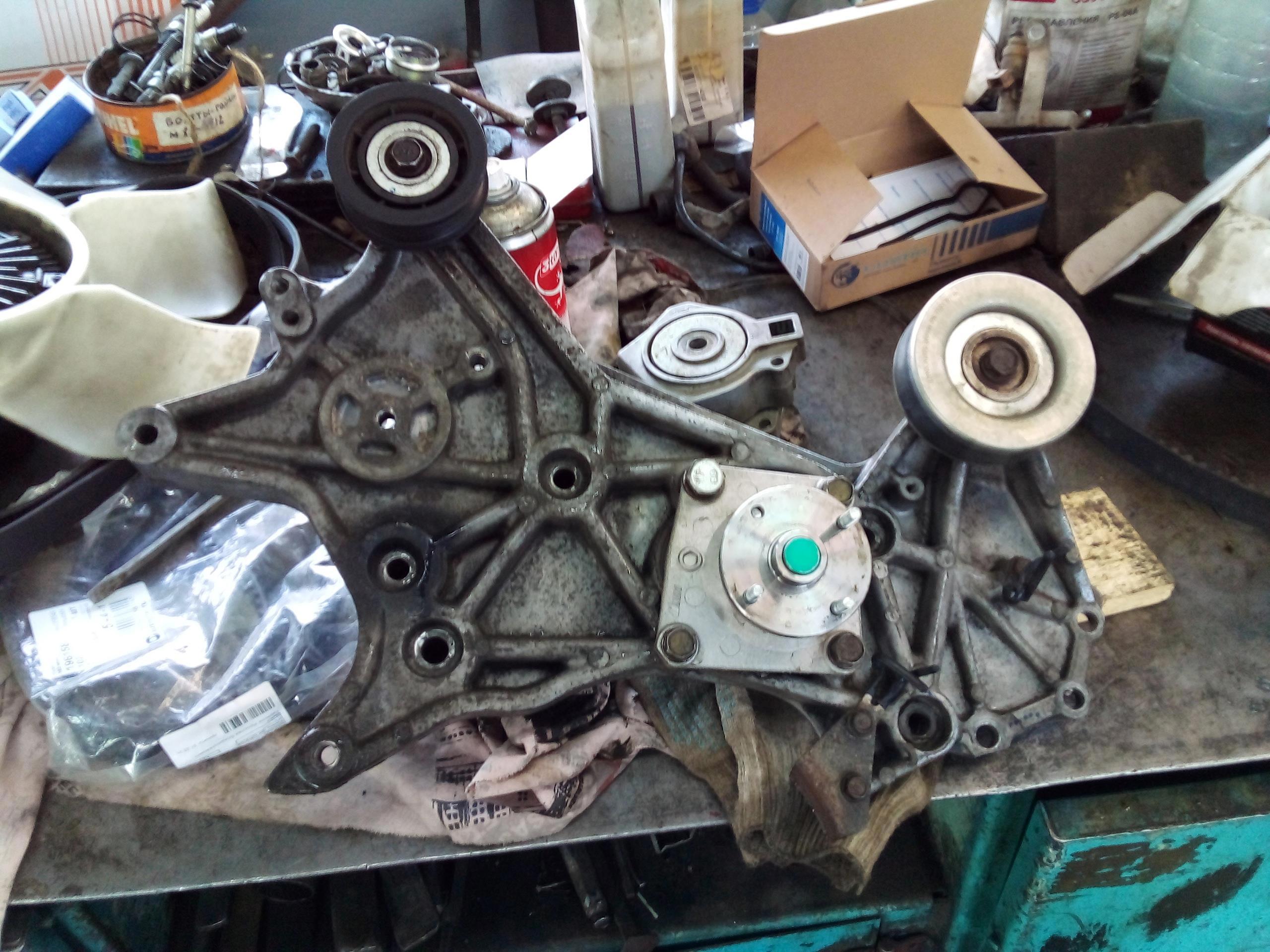 Готово. Самая большая плюшка тут - здоровенная пластина, на которой закреплен генератор, обводные ролкики, и натяжной ролик. Она привернута к блоку девятью вроде болтами (много их там, да), и два из них под натяжным роликом. Снимаем его нафиг!