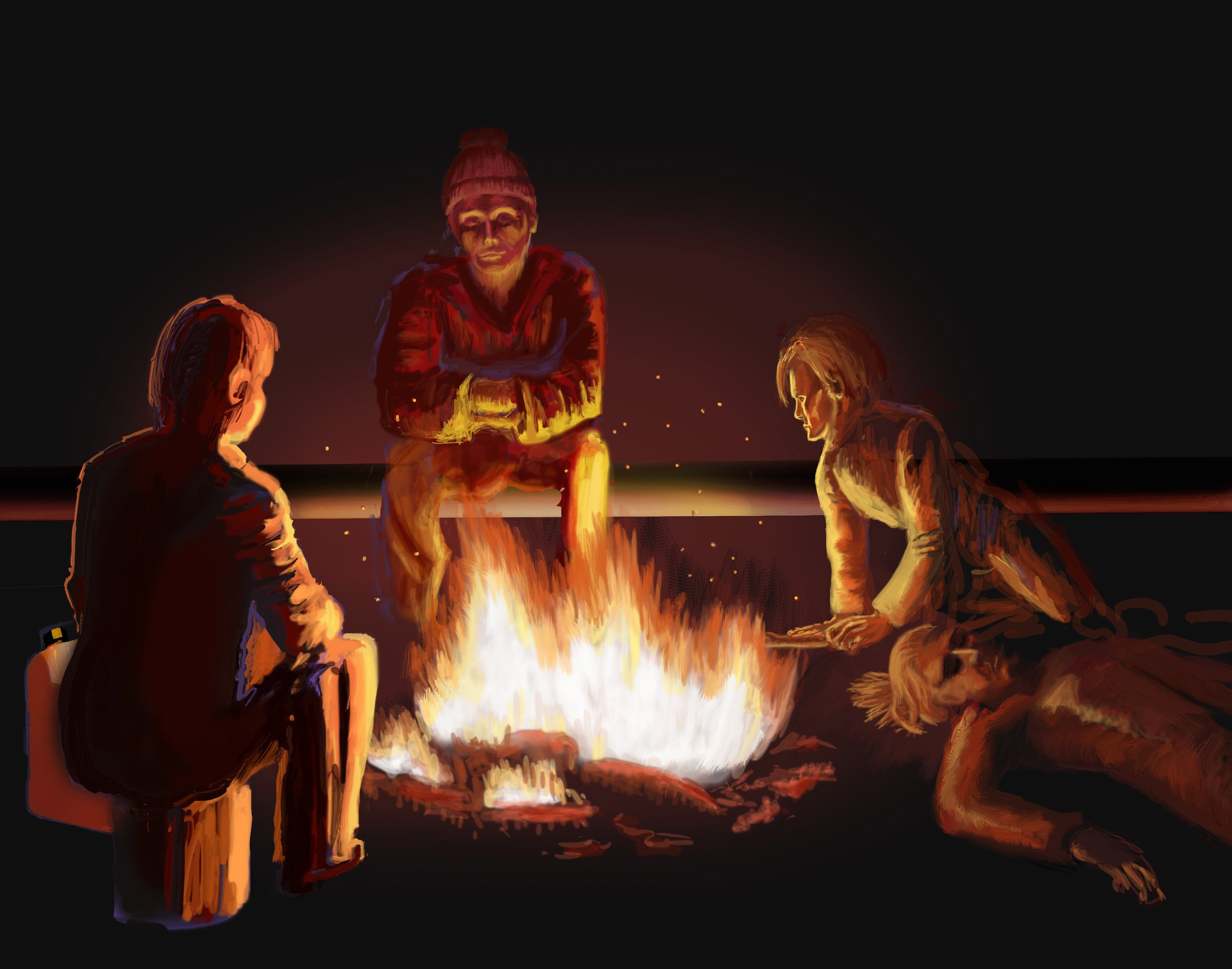 это банда у костра, разведенного в подвале Башни Тесака от Рионы Рей