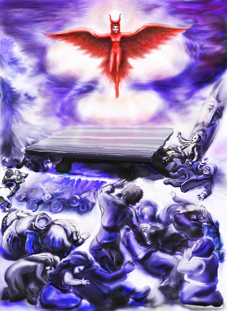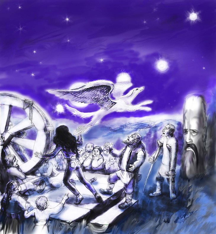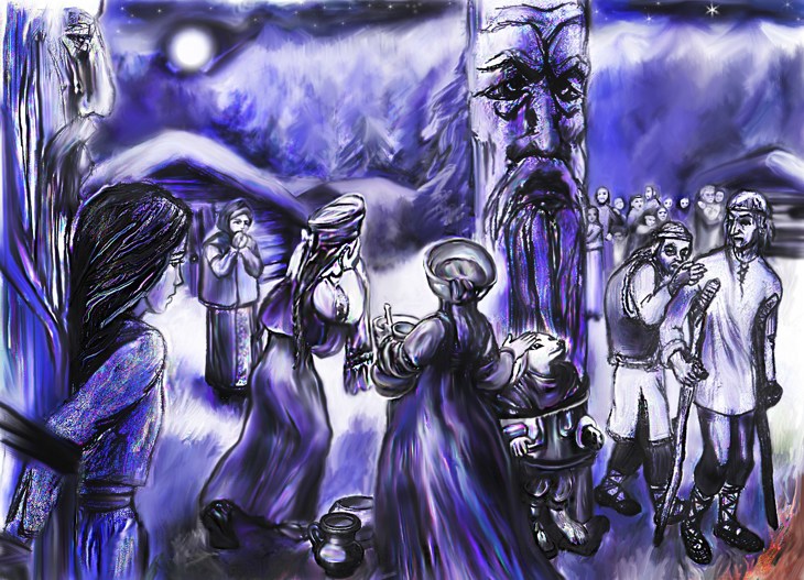 К примеру, на иллюстрации к главе 6 "Восход третьей Луны" изображено жертвоприношение идолам путём сожжения. Само сожжение я рисовать не стала, оно подробно описано в главе 5 "У столба".