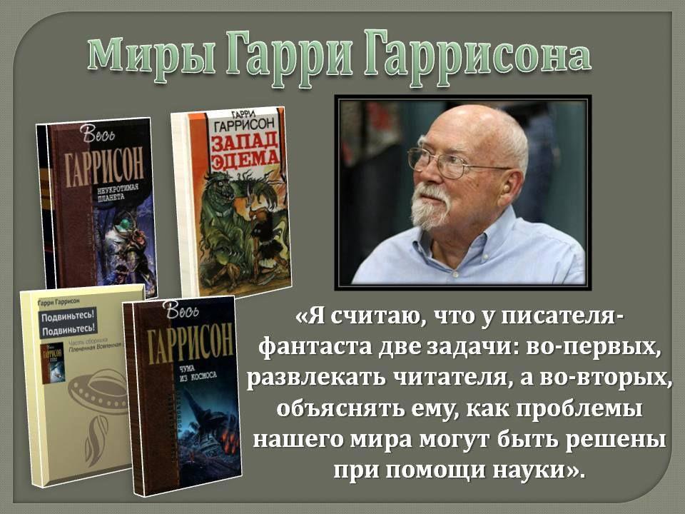 Автор: Виктор ШипуновГарри Гаррисон родился 12 марта 1925 года в Стемфорде (штат Коннектикут, США), в семье печатника. После окончания школы и службы в армии, он поступил в колледж в Нью-Йорке, выбрав школу карикатуристов и иллюстраторов. Впоследствии несколько лет Гаррисон рисовал и писал тексты для фантастических комиксов, иллюстрировал журнал научной фантастики «Worlds Beyond», редактировал произведения научной фантастики, приключенческие сцены для различных издательств.