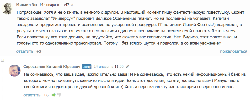 Самое обидное, что не знаю, получилось ли. Но опубликую, естественно: не пропадать же добру?! Предположительно со следующей недели. А сам в это время ознакомлюсь с книгой Сиростанова, потому как подобные совпадения знаменательны. Вот только что они знаменуют: единый вселенский информационный банк, из которого все авторы черпают вдохновение, или что-то другое, – ума не приложу.