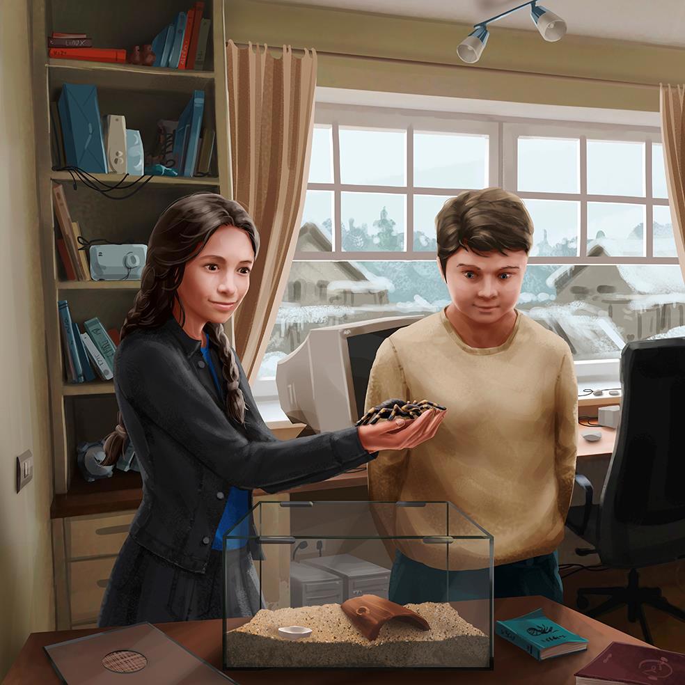 Первое знакомство вышло не очень-то радостным: Том как только мог делал вид, что не испугался мадам Гертруду вида Brachypelma boehmei, и слова девочки его никак не задели... А Берти не поняла, ни как она может стать пауком, ни почему парнишка так не любит Римскую Церковь... Не знала она и главного - что он из 13 века. Но у них еще море времени, чтобы подружиться и все выяснить.