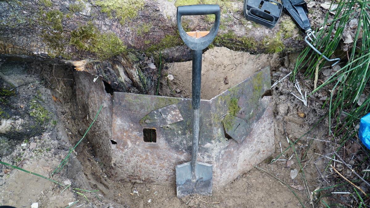 Начали добычу. Вспомогательными задачами было не убиться самим и не сломать берёзу. Сложность была в том, что дерево одним из толстенных боковых корней опиралось на третью грань щита, а его мелкий корень (в четыре пальца толщиной) насквозь пророс сквозь одну из пробоин.