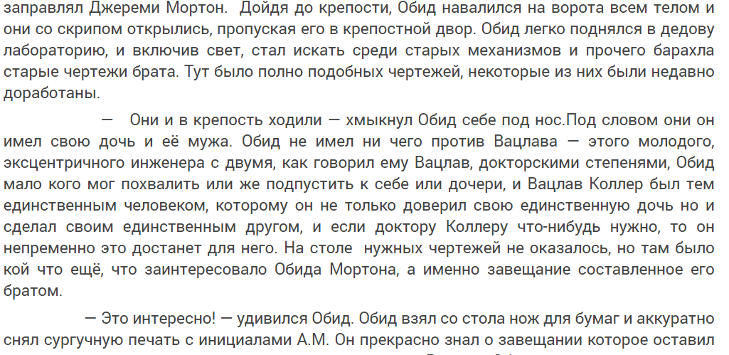 Но Обид принялся искать, ведь, в конце концов, Вацлав просил об этом, а своего зятя мужчина очень уважал: он не стал бы подпускать к своей дочери кого попало. (устанавливаем отношения между персонажами, органично вплетая это в действие + даем персонажу мотивацию).