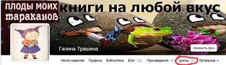 Так вот зайдёшь на страницу к автору... а там... книг море. Нажимаешь на кнопочку ПРОИЗВЕДЕНИЯ, настроение падает: нет охоты листать простыню, почему бы автору не раскидать книги по темам, благодаря разделу ЦИКЛЫ