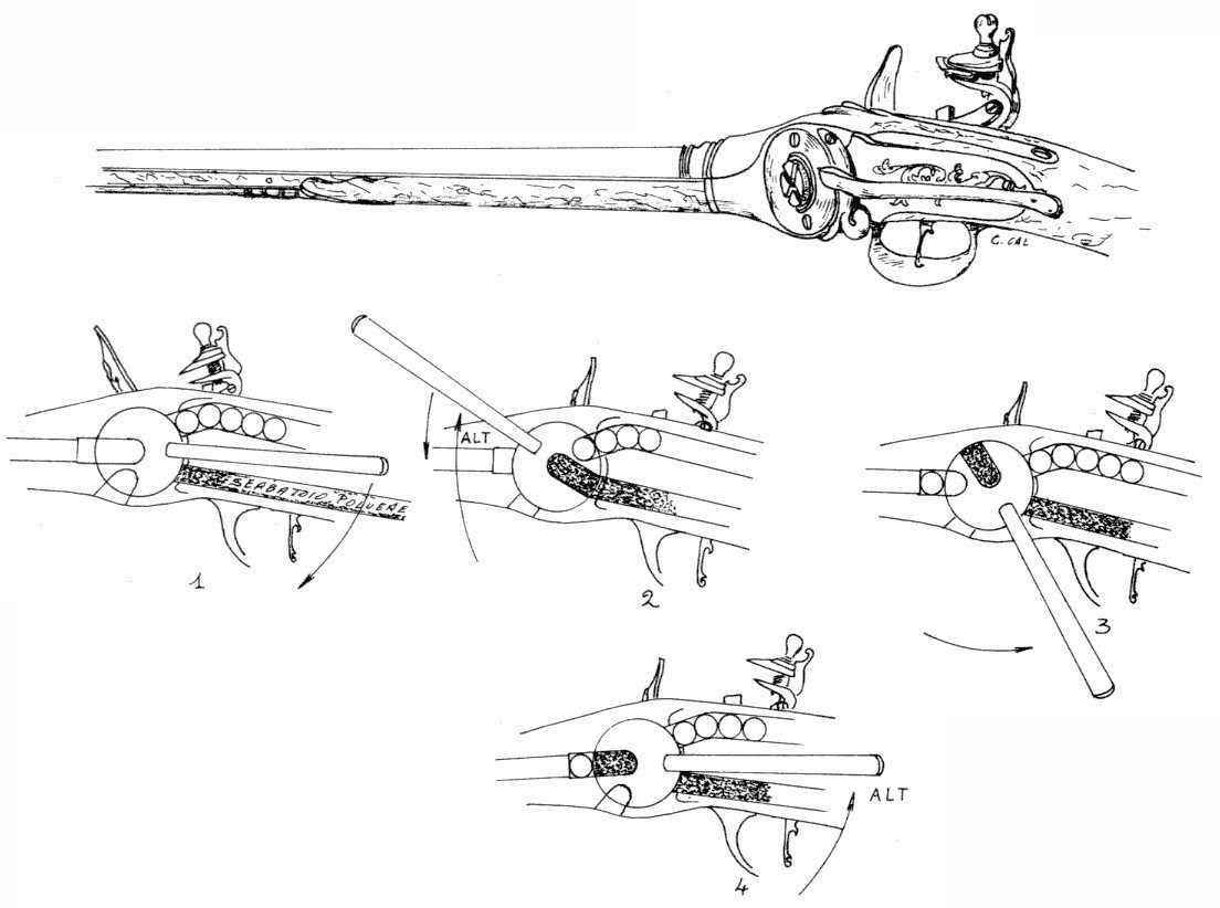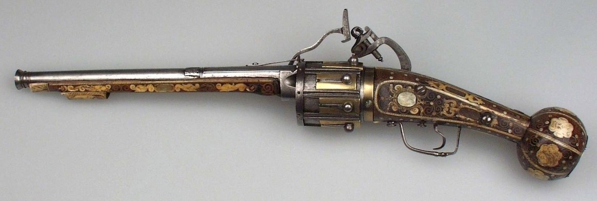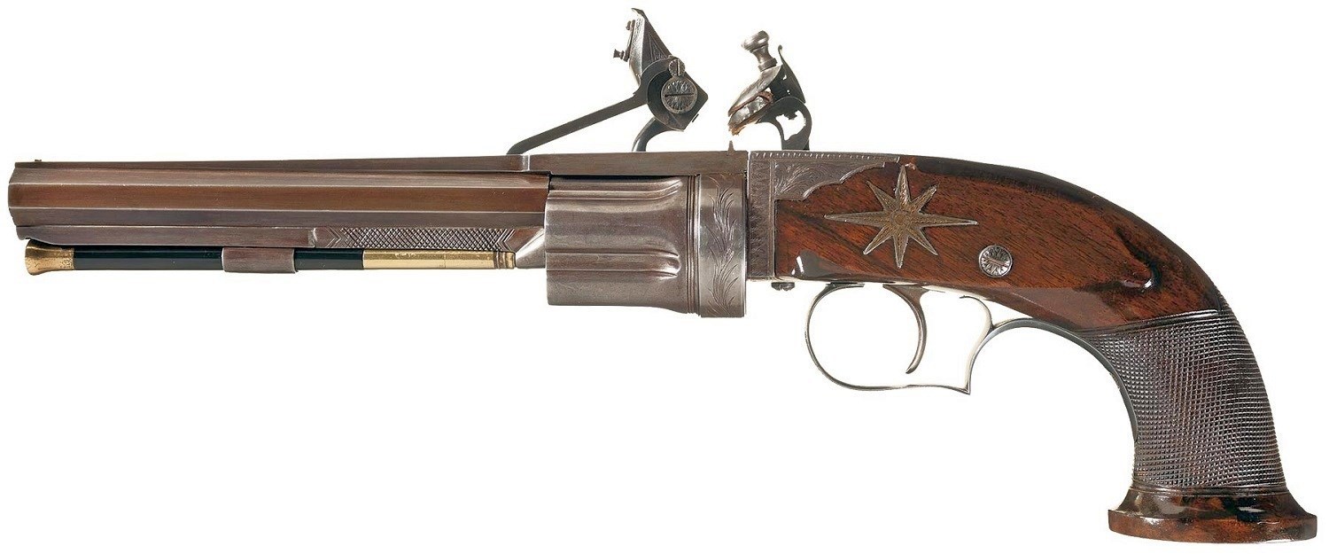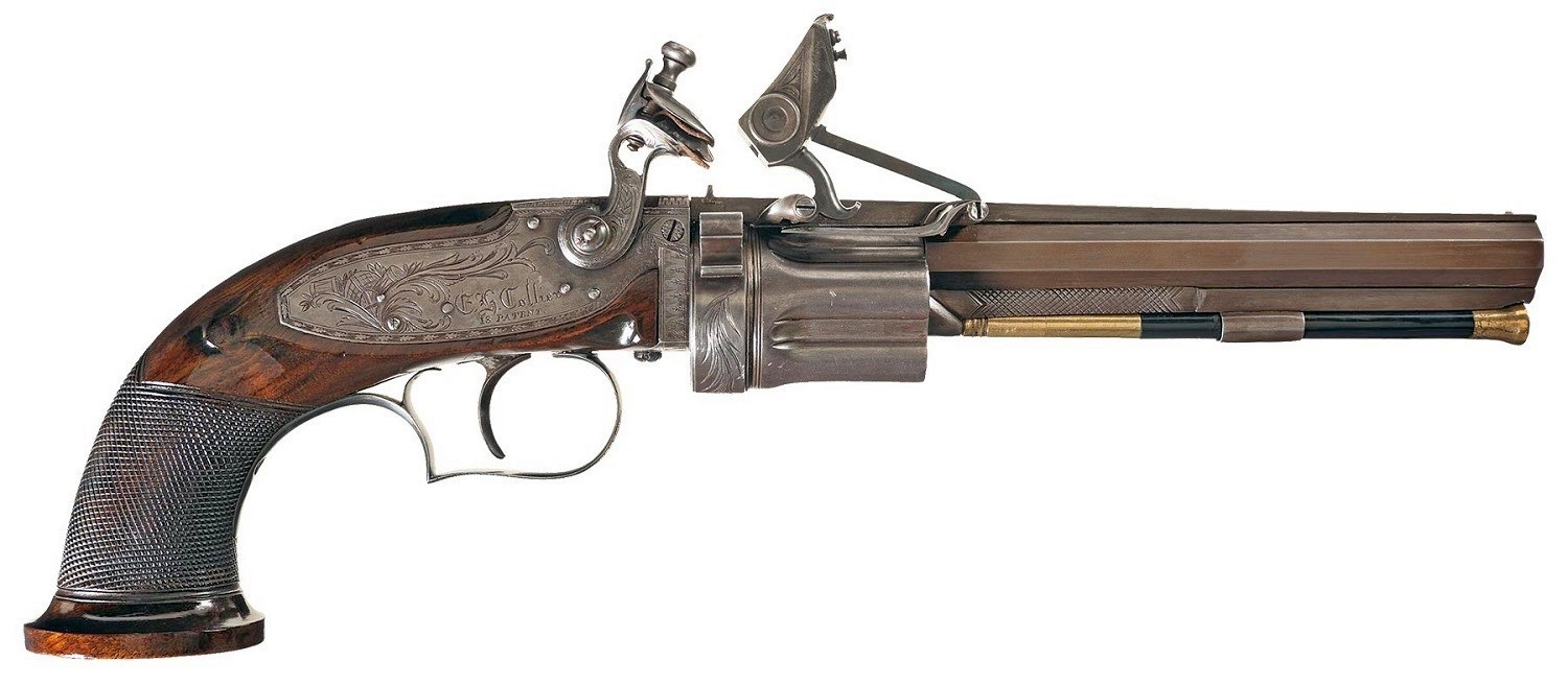 Зачем, скажите, такие сложности во времена кремнёвого оружия? К чему вообще делать револьверную кремнёвку? Действительно — ведь каждый раз нужно было после выстрела вручную поворачивать барабан, да ещё и порох на полочку подсыпать. Да — долго по нонешним временам, но представьте себе — если бы не барабан с зарядами, то пришлось бы дополнительно чистить ствол, насыпать порох, забивать пыж, вкладывать пулю, опять забивать пыж... как ни считай — крутить проще и быстрее.