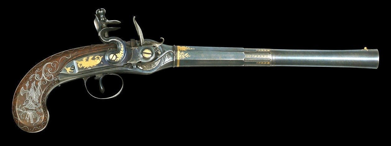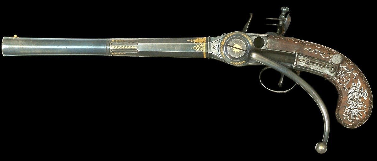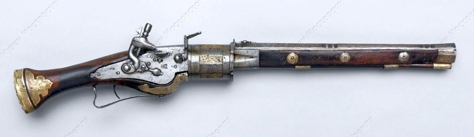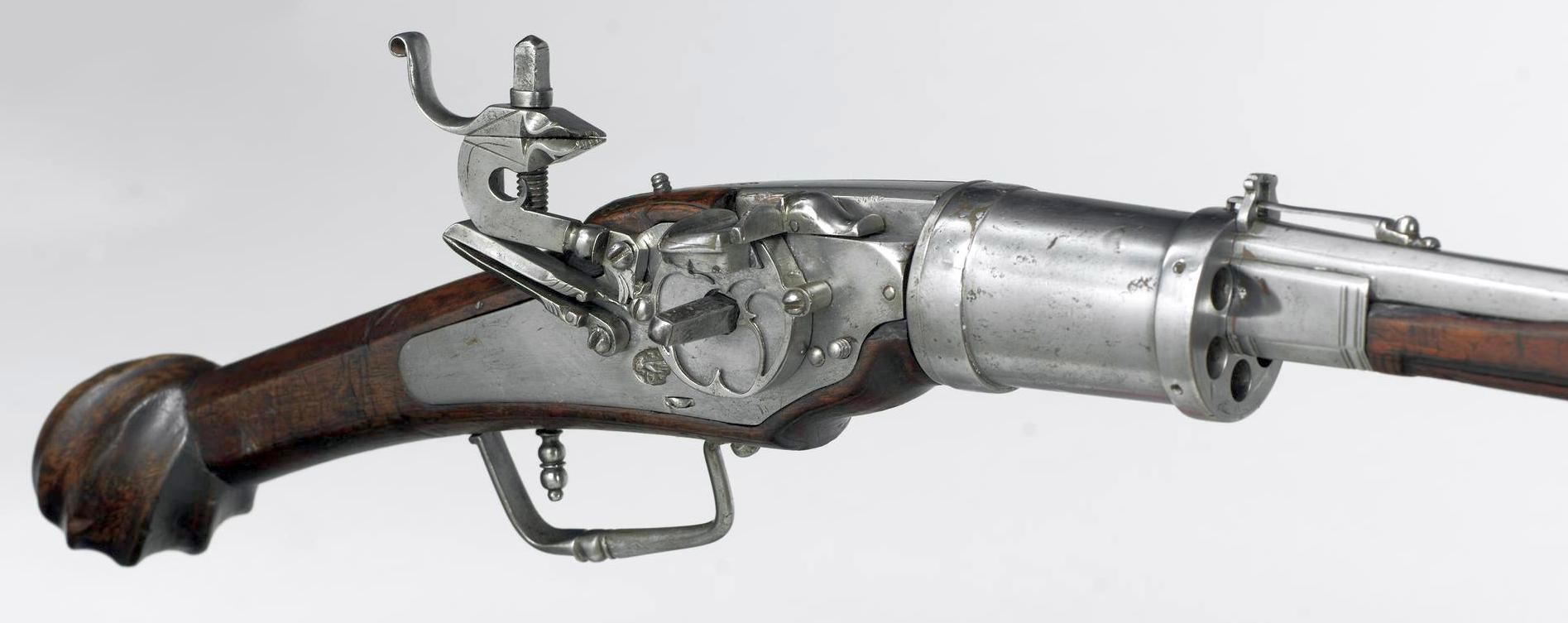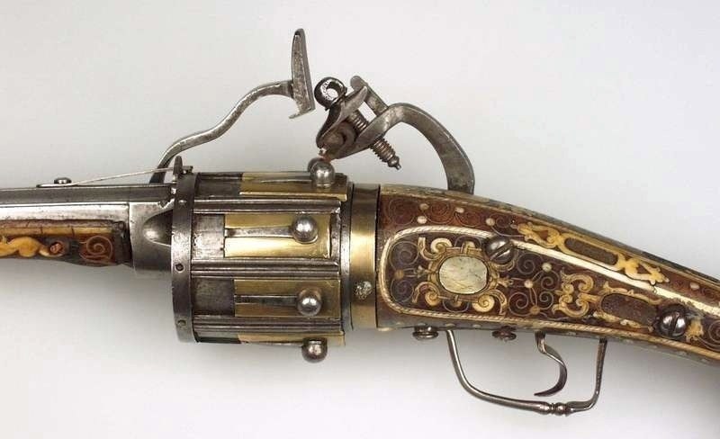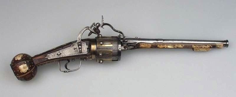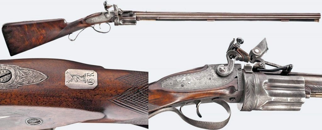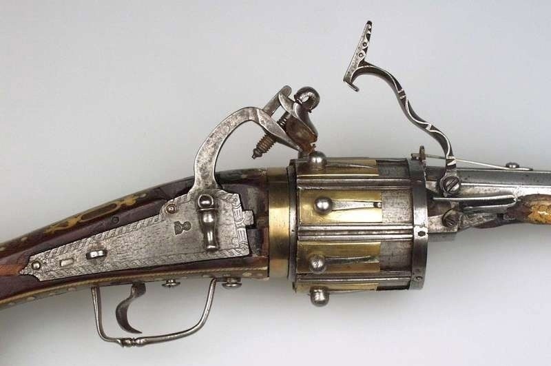 А вот ещё револьверное ружьё того же «кремнёвого века», созданное на основе деталей пистолета. Так делали довольно часто и позже, когда появились капсюльные пистолеты, а потом и оружие под унитарные патроны (я уже показывал револьверный карабин Ле Ма):