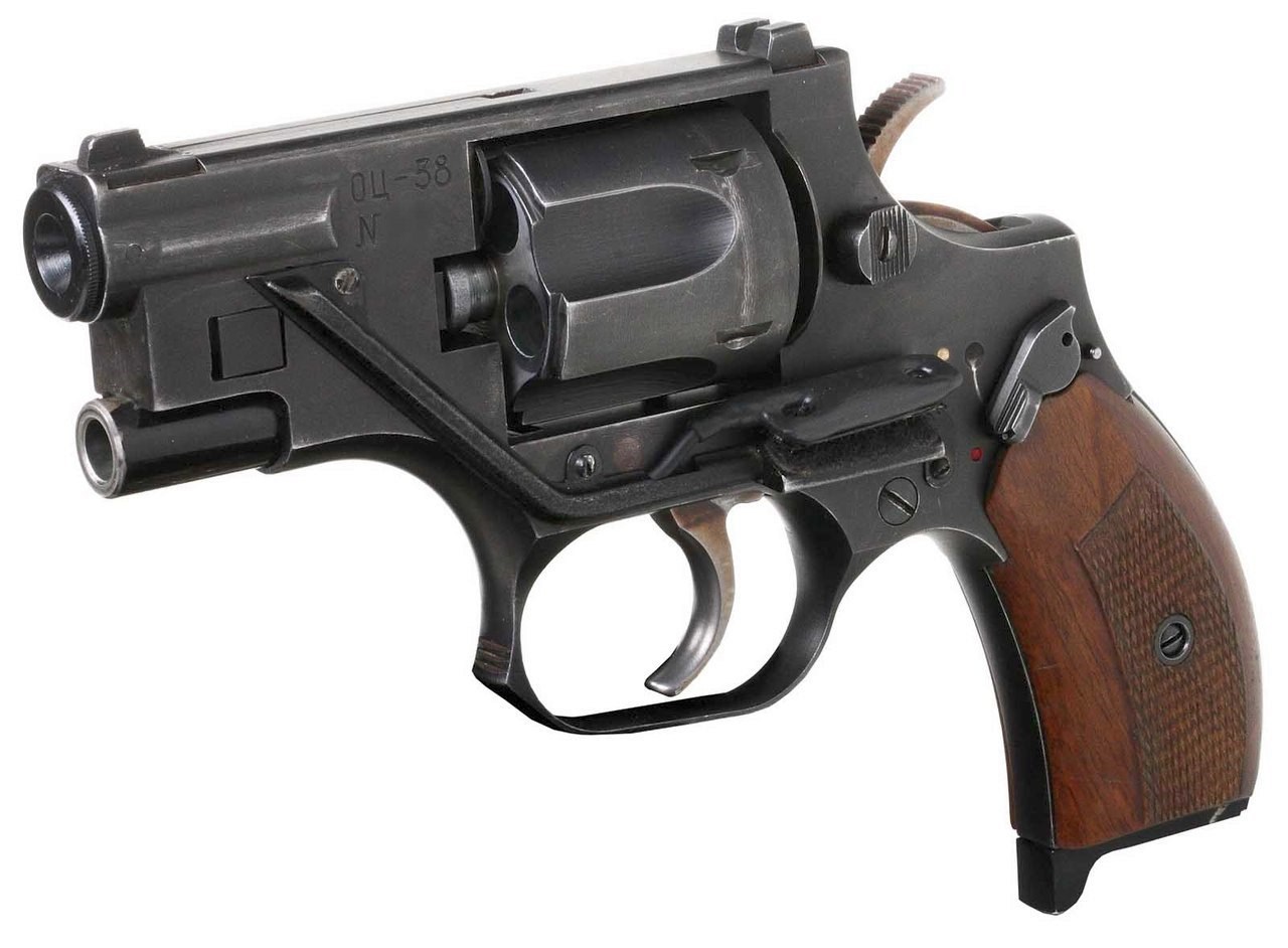 Но проектируются и совсем новые револьверы. Их век ещё не закончен. Вот, например, бесшумный револьвер Стечкина ОЦ-38 (последняя разработка легендарного конструктора). Ствол у него снизу, а верхняя трубка – лазерный целеуказатель: