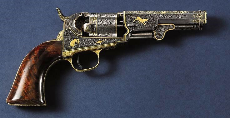 Да, да - вы угадали совсем правильно - это тот самый Кольт, хотя конкретно которой модели опознать достаточно трудно (вряд ли капсюльный образец). Реклама всё-таки большая сила. Даже Брежнев на неё купился, хотя револьвер действительно неплохой.