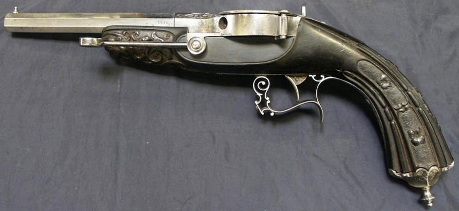 Но в целом эти первые ещё условные патроны проблему не сильно облегчили. Да и другие ещё не были кардинально решены. Например самовоспламенение при выстреле сразу нескольких зарядов с последующим разрушением пистолета в руках стрелка с самыми печальными для него последствиями.
