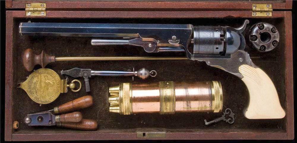 А вот так выглядел «подарочный» вариант позднего варианта револьвера Кольт Патерсон (уже с подствольным шомполом для зарядки) в коробке со всеми нужными штучками: