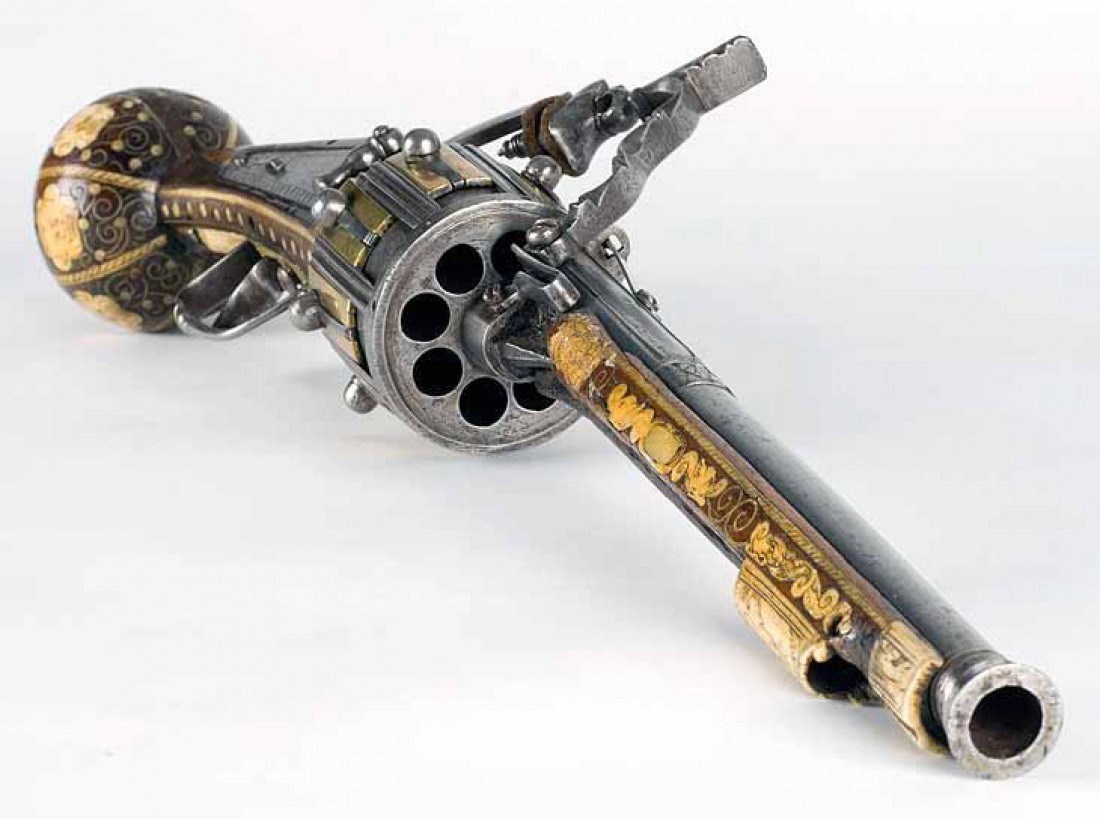 А ещё сейчас можно услышать очень патриотичную ссылку на Оружейную палату, в которой хранится много изделий легендарного оружейника Первуши Исаева. Среди этих изделий есть шестизарядный кремниевый пистолет-револьвер и пятизарядная охотничья пищаль-револьвер. Тоже кремниевая. Датируются изделия 1625 годом. Вот они: