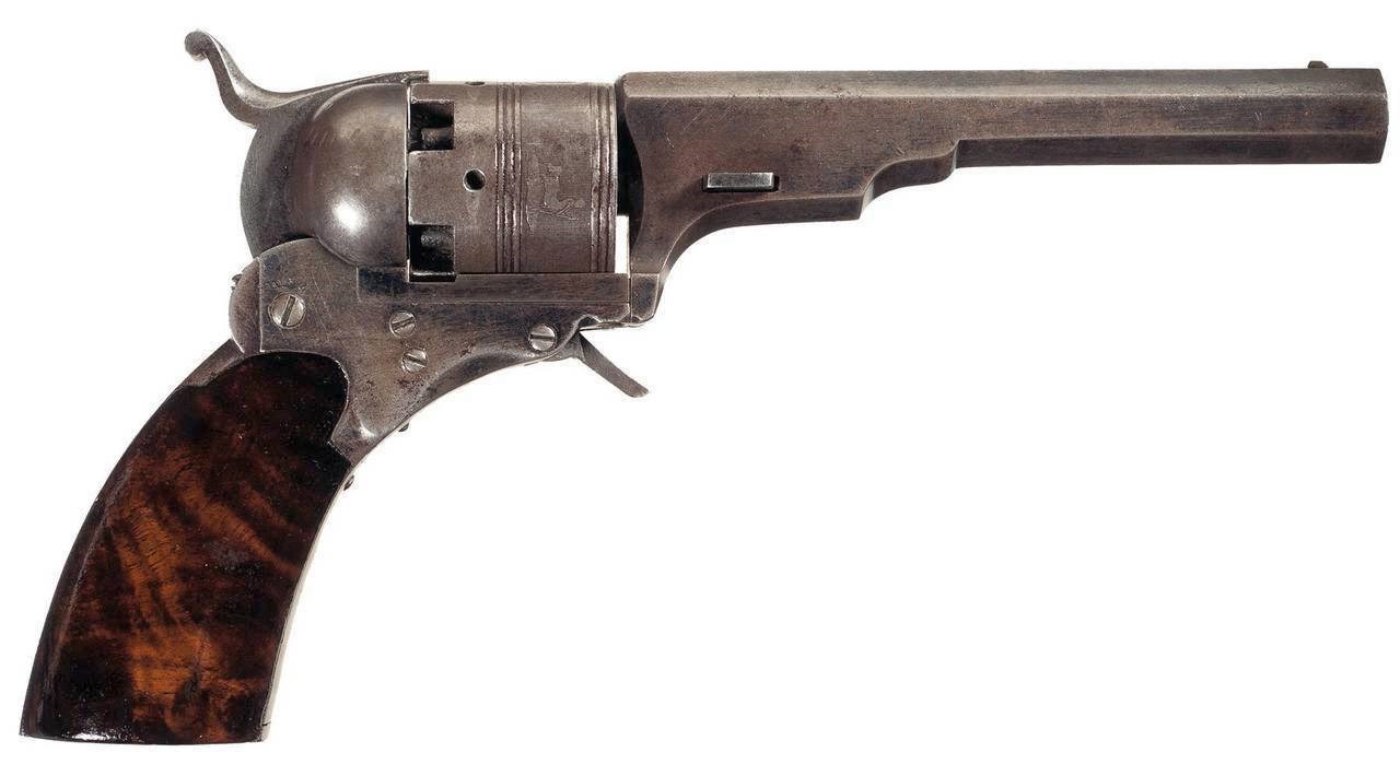 Ведь и конструктивно с револьверами всё было совсем не просто. Вот скажите, как правильно — вдоль или поперёк? Я имею в виду, как правильно барабан на револьвере нужно поставить? А-а-а... это сейчас всё все знают, и всем кажется, что это совершенно очевидно, но так было отнюдь не всегда. И я говорю совсем даже не про пулемёт Дегтярёва или Льюис, с которым товарищ Сухов бегал. Я про револьверы говорю, а среди них были и те, которые были поперёк. Вот такой, например, от Джона Кохрейна, образца 1834 года с нижним расположением курка: